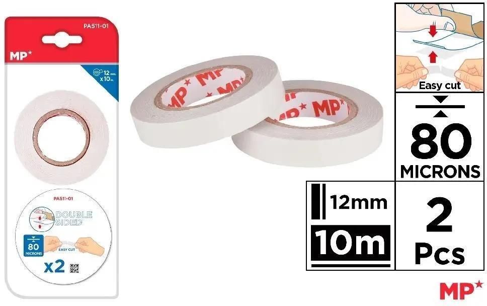 Dwustronna taśma samoprzylepna, z klejem po obu stronach,dzięki czemu jest bardzo przydatna do mocowaniado ściany lub łączenia lekkich przedmiotów,takich jak papier, zdjęcia, karton...bez widocznej taśmy. Łatwy do cięcia. 80mikronów. Rolka 12 mm x 10 m. Blister z 2 rolkami. NAZWA TAŚMA DWUSTRONNA …