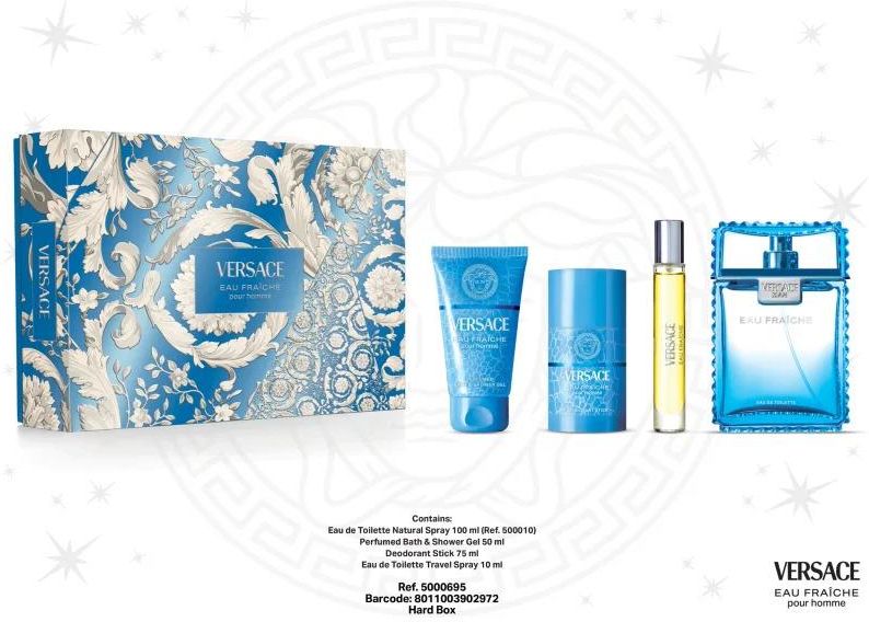Versace Eau Fraîche, , Zestawy dla mężczyzn dla mężczyzn, Właściwości: kosmetyki perfumowane przedłużają trwałość zapachu doskonały pomysł na prezent Zawartość zestawu: Eau Fraîche woda toaletowa 50 ml Versace Eau Fraîche balsam po goleniu 50 ml Versace Eau Fraîche żel pod prysznic 50 ml