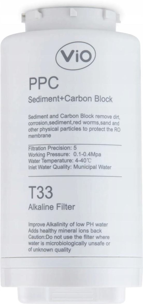 WYMIENNY FILTR DO SYSTEMU ViO BP-D800G i ViO BP-D1200G (PPC+ T33) Wkład filtracyjny PPC+ T33 to innowacyjne rozwiązanie, które łączy w sobie funkcje filtra sedymentacyjnego, węglowego i alkalicznego. Dzięki niemu woda staje się krystalicznie czysta, pozbawiona zanieczyszczeń i wzbogacona w korzystne minerały. To idealny wybór dla osób dbających o zdrowie i najwyższą jakość wody w domu. Ten wkład do systemów ViO BP-D800G i BP-D1200G został zaprojektowany z myślą o skutecznej i bezpiecznej filtracji wody. Dzięki trzem funkcjom w jednym module, zapewnia nie tylko oczyszczanie, ale także poprawę smaku i właściwości wody pitnej. Najważniejsze cechy Filtracja wielostopniowa – usuwa brud, korozję, osad, piasek i inne zanieczyszczenia mechaniczne. Ochrona membrany RO – przedłuża żywotność systemu filtracyjnego. Mineralizacja i alkalizacja – wzbogaca wodę w jony mineralne i podnosi jej pH. Wydajność – do 4300 litrów dziennie (3,1 l/min). Łatwa wymiana – nie wymaga odcinania dopływu wody. Bezpieczeństwo – wykonany z wysokiej jakości tworzywa sztucznego z gumowanym uchwytem. Filtr Do Wody ViO BP-D800G i BP-D1200G PPC+ T33 – Dane Techniczne Dokładność filtracji: 5 mikronów. Ciśnienie robocze: 0,1–0,4 MPa. Temperatura wody: 4–40°C. Materiał: tworzywo sztuczne, gumowany uchwyt. Kompatybilność: systemy ViO BP-D800G oraz ViO BP-D1200G. Wkład Filtracyjny PPC+ T33 Do Systemów ViO – Korzyści i Zalety Zdrowsza woda – alkaliczna, z dodatkiem minerałów, poprawiająca smak i właściwości. Skuteczna ochrona – filtr zatrzymuje duże cząstki, chroniąc instalację i membranę. Wysoka wydajność – idealny do codziennego użytku w gospodarstwach domowych. Łatwość montażu – szybka wymiana bez specjalistycznych narzędzi. Niezawodność – sprawdzona konstrukcja i materiały wysokiej jakości. Wymienny filtr PPC+ T33 ViO to gwarancja czystej, zdrowej i smacznej wody każdego dnia. Kompatybilny z systemami ViO BP-D800G i ViO BP-D1200G, stanowi niezbędny element dla bezproblemowej i wydajnej pracy Twojego filtra do wody.