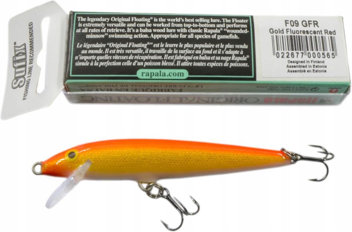 F09 GFR WOBLER RAPALA ORIGINAL FLOATING 9 CM 5 G Polecamy na okonia, szczupaka i inne drapieżnik. Nieustannie najlepszy na świecie! Bez względu na to, czy stosowany jako wobler powierzchniowy, czy jako płytko schodzący, czy też jako głębinowa przynęta prowadzona z zewnętrznym dociążeniem, zawsze szokuje swoją skutecznością!Korpus Oryginala jest wykonany z balsy. Jest to przynęta wyjątkowowszechstronna i do zastosowania w niemal każdych warunkach. Charakteryzuje siętym, że jest ręcznie dostrajany przez testerów Rapala, przez co jestniezwykle skuteczny bez względu na głębokość. Rapala Oryginal nie ma sobie równychdzięki specyficznej pracy, niezależnie od prędkości zwijania linki. Gatunek: wszystkie ryby drapieżne Technika: Spinning & Trolling Głębokość pracy: 0,9 - 1,5 m - płytko schodzący Typ: pływający Wielkość: 9 cm Waga: 5 g