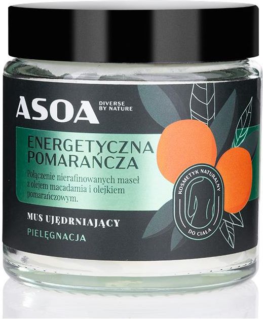 Asoa Mus Ujędrniający na cellulit Energetyczna Pomarańcza 120ml Asoa Mus ujędrniający Energetyczna Pomarańcza ASOA to kosmetyk do intensywnej pielęgnacji skóry zwiotczałej, wymagającej regeneracji oraz z problemem cellulitu. Regularnie stosowane masło poprawia kondycję, napięcie i sprężystość skóry. Minimalizuje widoczność pomarańczowej skórki oraz dekoruje ciało energetycznym zapachem soczystej pomarańczy. Składniki aktywne musu ujędrniającego Energetyczna Pomarańcza ASOA: Masło shea (Butyrospermum Parkii Butter) – skarbnica witamin, antyoksydantów, wosków i kwasów tłuszczowych, chroni przed utratą wody z naskórka. Natłuszcza, odżywia, regeneruje oraz łagodzi podrażnienia. Wykazuje właściwości antybakteryjne i przeciwzapalne, zmiękcza oraz uszczelnia i naprawia warstwę hydrolipidową skóry. Intensywnie pielęgnuje, poprawia nawilżenie, koi skórę łuszczycową, z AZS oraz suchą i podrażnioną. Olej kokosowy (Cocos Nucifera Oil) – odżywia, nawilża, natłuszcza i zmiękcza skórę. Uszczelnia barierę lipidową oraz zapobiega swędzeniu. Olej makadamia (Macadamia Ternifolia Seed Oil) – odżywia, regeneruje, nawilża, odmładza, rewitalizuje oraz przeciwdziała przesuszeniu, szorstkości i łuszczeniu. Zmiękcza, wygładza i naprawia uszkodzoną oraz podrażnioną skórę, poprawia jej kondycję i chroni przed utratą wilgoci. Witamina E (Tocopheryl Acetate) – antyoksydant, chroni skórę przed przedwczesnym starzeniem, przeciwdziała powstawaniu stanów zapalnych, poprawia ukrwienie i wzmacnia ściany naczyń krwionośnych.