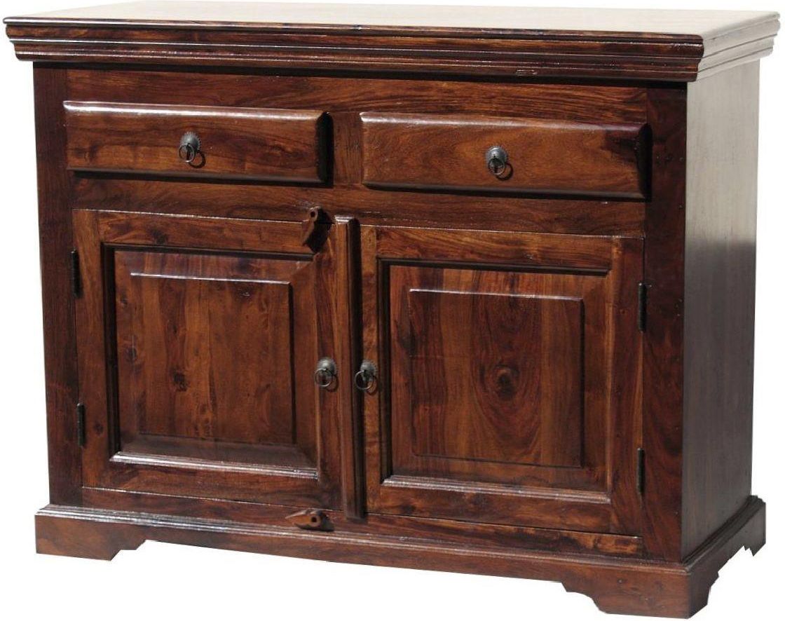 Szerokość: 110cm/ Głębokość: 45cm/ Wysokość: 85cm/ Drewniana komoda w stylu kolonialnymCechy produktu: - mebel wykonany z litej deski akacji indyjskiej - dwie niewielkie szuflady zakończone metalowym uchwytem - szuflady na drewnianych prowadnicach - szafka zamykana na podwójne drzwi przedzielona …