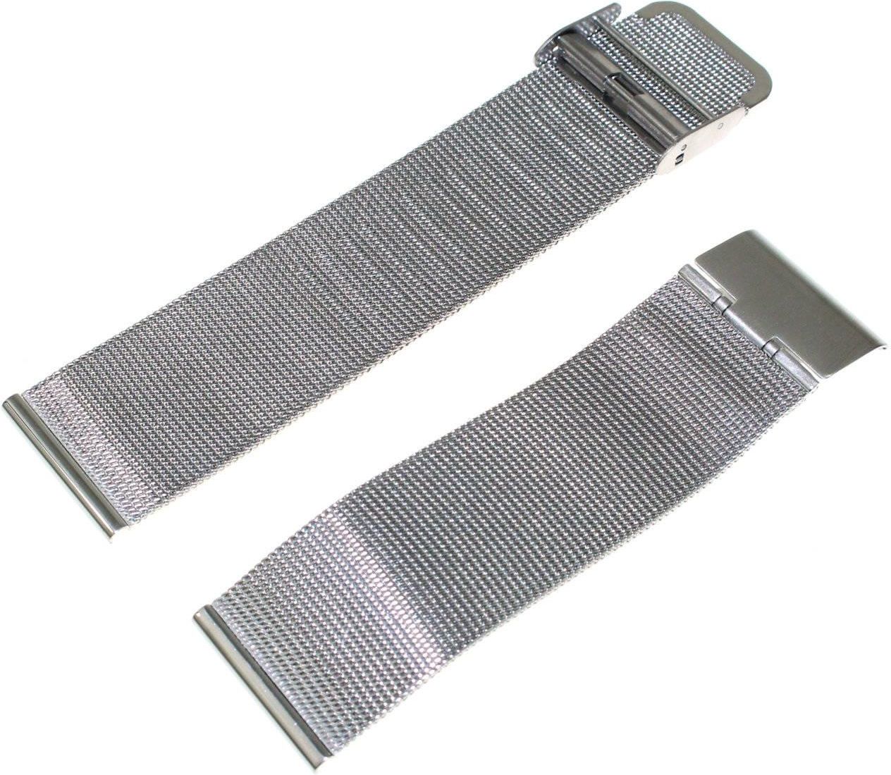 Srebrna stalowa prosta błyszcząca siatkowa / mesh / wzór mediolański bransoletka do zegarka. Producent DILOY. Szerokość 24 mm. Bransoleta pasuje do każdego zegarka i smartwatcha ze standardowym mocowaniem o szerokości 24 mm. Komplet teleskopów gratis