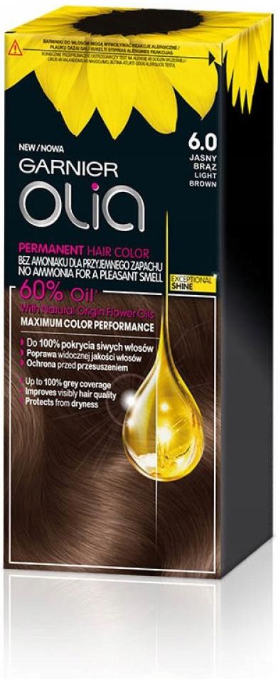 Garnier Olia farba do włosów bez amoniaku Innowacyjna formuła koloryzacji włosów o pięknym, kwiatowym zapachu. Farba do włosów Olia to produkt zapewniający trwałą koloryzację, bez amoniaku. Kosmetyk zawiera aż 60% naturalnych olejków, które nie tylko dogłębnie odżywiają włosy, ale także odgrywają kluczową rolę w procesie koloryzacji. Sprawiają, że kolor maksymalnie wnika w głąb włosa. Zapewniają do 100% procent pokrycia siwych włosów, a także intensywny i trwały kolor pełen blasku. Farba poprawia kondycję włosów, widocznie je wygładzając i nawilżając. Farba w postaci aksamitnego kremu nie spływa z włosów, dzięki czemu aplikacja produktu jest niezwykle prosta i przyjemna.  Efekty 100% procent pokrycia siwych włosów poprawa kondycji włosów trwała koloryzacja