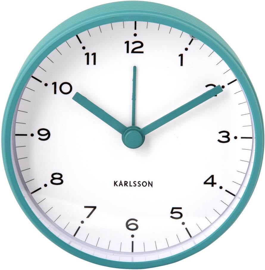 Niebieski turkusowy matowy okrągły klasyczny podświetlany budzik kwarcowy Karlsson Circus Rings KA6010BL. Budzenie dźwiękiem narastającym. Mechanizm kwarcowy z cichym (płynącym) sekundnikiem. Elegancki zegar, budzik stołowy szafkowy do pokoju, sypialni