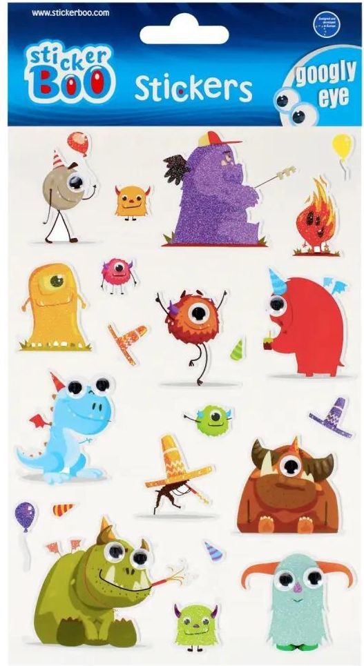 Naklejki STICKER BOO z grafik w brokatowe potworki z ruchomymi oczami z pewnoci przypadn do gustu dzieciakom, idealne do zdobienia rysunkw, wszelkiego rodzaju prac plastycznych oraz kolekcjonowania. Na blisterku znajduj si 23 szt. naklejek.
