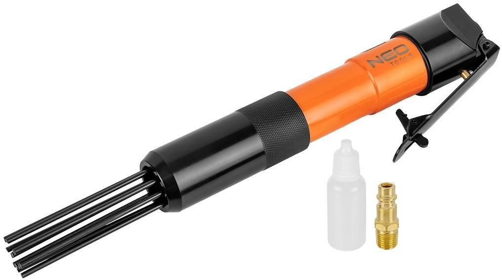 NEO Pneumatyczny młotek igłowy czołowy do rdzy i spawów 12 x 3 mm NEO Pneumatyczny młotek igłowy czołowy do rdzy i spawów 12 x 3 mm to narzędzie, które łączy w sobie wysoką wydajność oraz precyzję. Dzięki zastosowaniu sprężonego powietrza, młotek ten doskonale sprawdza się w oczyszczaniu powierzchni metalowych, eliminowaniu rdzy oraz obróbce spawów. Jego ergonomiczna konstrukcja oraz wysokie parametry techniczne przyciągają uwagę zarówno profesjonalistów, jak i hobbystów. Zastosowanie Młotek igłowy jest przeznaczony do wykonywania różnorodnych prac, które wymagają skutecznego usuwania rdzy i zanieczyszczeń metalowych. Jego wszechstronność sprawia, że można go wykorzystać w wielu sytuacjach. Oto przykłady zastosowań, w których to narzędzie może być niezwykle pomocne: oczyszczanie powierzchni metalowych z rdzy i osadów, przygotowywanie spawów przed dalszą obróbką, prace w warsztatach samochodowych i przemysłowych, utrzymanie narzędzi i maszyn w dobrym stanie. Parametry techniczne Ten młotek igłowy charakteryzuje się wysokimi parametrami technicznymi, które są istotne dla jego wydajności: Ciśnienie robocze: 6,3 bara – co zapewnia efektywne działanie w trudnych warunkach, Średnie zużycie powietrza: 125 litrów na minutę – istotne dla użytkowników, którzy muszą zorganizować odpowiednie źródło sprężonego powietrza, Maksymalna częstotliwość udaru: 4000 suw/min – umożliwia szybkie i skuteczne działanie na metalowych powierzchniach. Waga i ergonomia Młotek do rdzy waży 1,3 kg, co czyni go lekkim i poręcznym narzędziem. Niska waga jest korzystna dla użytkowników, którzy muszą pracować przez dłuższy czas, ponieważ zmniejsza zmęczenie rąk. Wymiary urządzenia to 8,00 cm szerokości, 5,10 cm wysokości oraz 32,00 cm długości, co ułatwia jego przechowywanie oraz transport. Materiał wykonania Wysoka jakość materiałów użytych do produkcji młotka igłowego wpływa na jego trwałość oraz odporność na uszkodzenia. Narzędzie zostało zaprojektowane z myślą o intensywnym użytkowaniu, co jest istotne w kontekście długotrwałych prac w wymagających warunkach. Narzędzie spełnia normy jakości potwierdzone certyfikatem CE, co stanowi dodatkowe potwierdzenie jego niezawodności. Zastosowania Młotek igłowy znajduje zastosowanie w różnych branżach, a jego wszechstronność sprawia, że jest to narzędzie odpowiednie dla profesjonalnych rzemieślników oraz hobbystów. Kluczową kwestią do podkreślenia jest, że narzędzie powinno być używane z odpowiednim źródłem sprężonego powietrza, co jest istotne dla jego funkcjonalności. Użytkownik powinien również stosować odpowiednie środki ochrony osobistej, aby zminimalizować ryzyko urazów związanych z hałasem oraz pyłem. Młotek igłowy marki NEO to solidne narzędzie, które przy odpowiednim użytkowaniu może być niezastąpione w wielu pracach związanych z obróbką metalu, zapewniając skuteczność i wydajność działania.