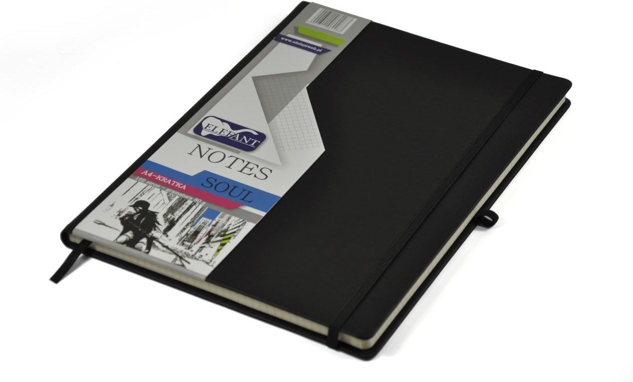 Notatnik biurowy twardy w kratkę zamykany na gumkę A4 Elefant SOUL Elegancki notatnik w wysokiej jakości skóropodobnej twardej okładce zaprojektowany zgodnie z aktualnymi trendami w designie i modzie. Notatnik firmy Elefant charakteryzuje się wysoką jakością papieru oraz okładki która ochroni wszystkie ważne notatki. Szczegóły produktu Notes formatu A4 w twardej skóropodobnej oprawie Zamknięcie za pomocą gumki, dzięki której notes nie otwiera się w torbie lub plecaku. Idealny do robienia notatek w szkole, na studiach lub w biurze, do wpisywania notatek biznesowych. Gramatura papieru: 80g/m2 Papier w delikatnym kolorze chamois Karki w czarną kratkę bez marginesu. Posiada taśmę, która pełni funkcję zakładki. Format A4 z zaokrąglonymi narożnikami. Kartki są zszywane i klejone. Wewnętrzna strona okładki z kieszenią. Kolor okładki: czarny. Producent: Elefant