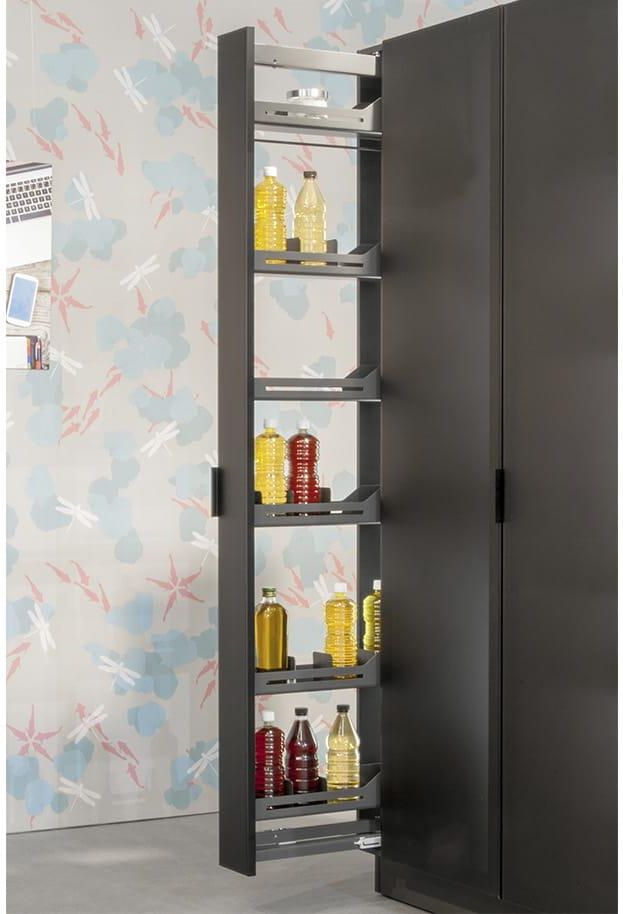 DISPENSA Libell 1600-1900/ 200/ 5/ szara 01.1305.KPL/S Wyciąg przeznaczony jest do szafki typu cargo o szerokości frontu 200 mm i wysokości ramy w przedziale 1200-1600 mm. Metalowy kosz wykonany w linii Libell w kolorze szarym. Kosze zostały doposażone w matę antypoślizgową w kolorze antracytowym, …