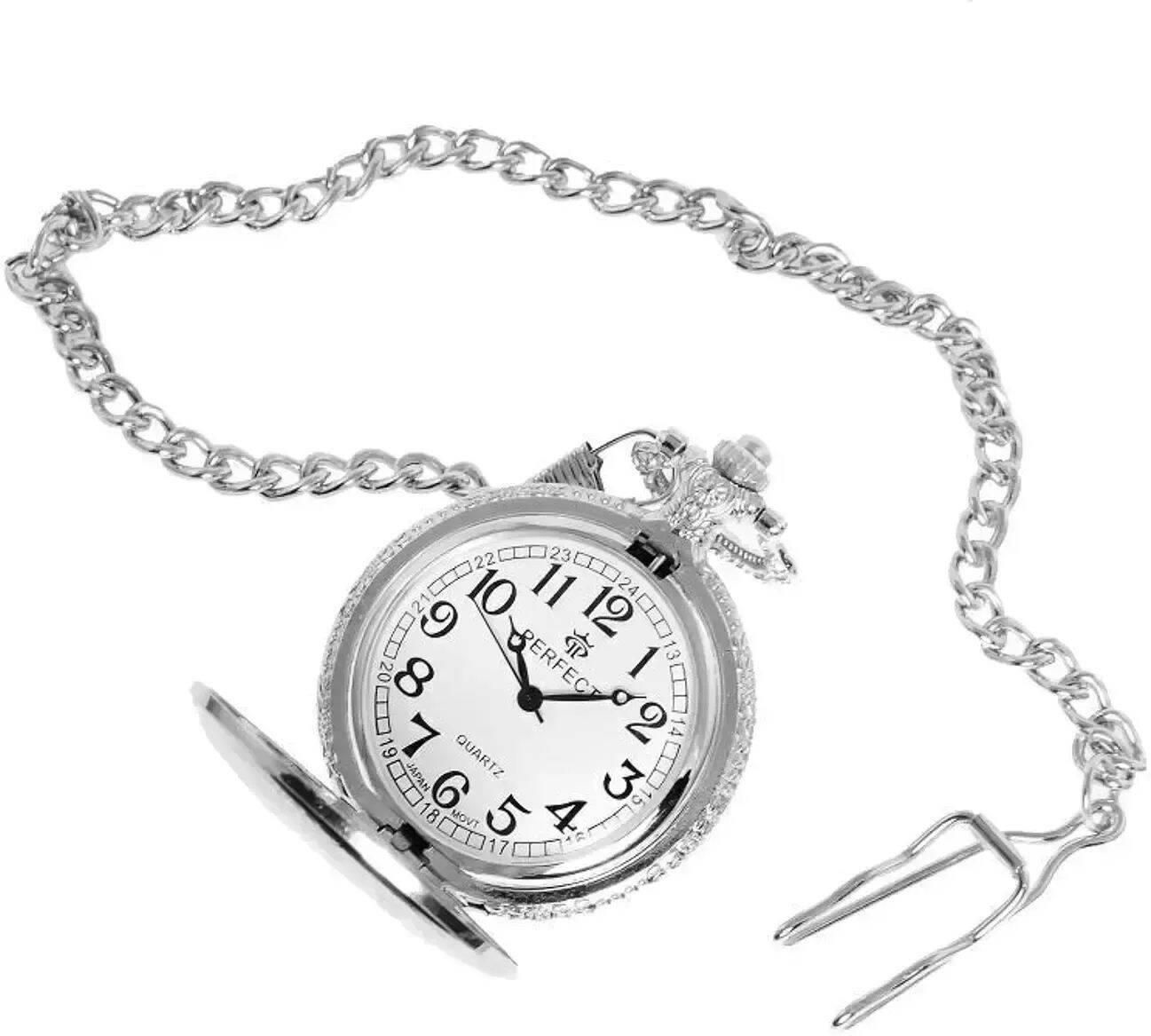 Męski klasyczny okrągły czytelny zegarek kieszonkowy dewizka na łańcuszku Perfect A04-PNP - metalowa koperta i łańcuszek w kolorze srebrnym, biała tarcza czasomierza, kontrastowe cyfry i wskazówki, klasa szczelności 30M. Japoński mechanizm kwarcowy