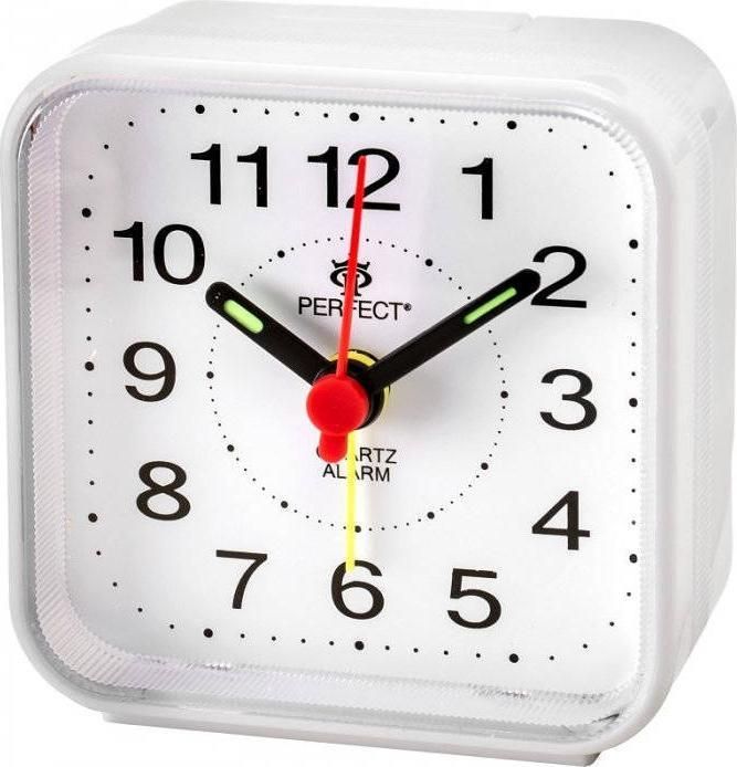 Czytelny klasyczny budzik kwarcowy Perfect SQ883 WH. Budzenie stałym dźwiękiem elektronicznym. Mechanizm kwarcowy tykający