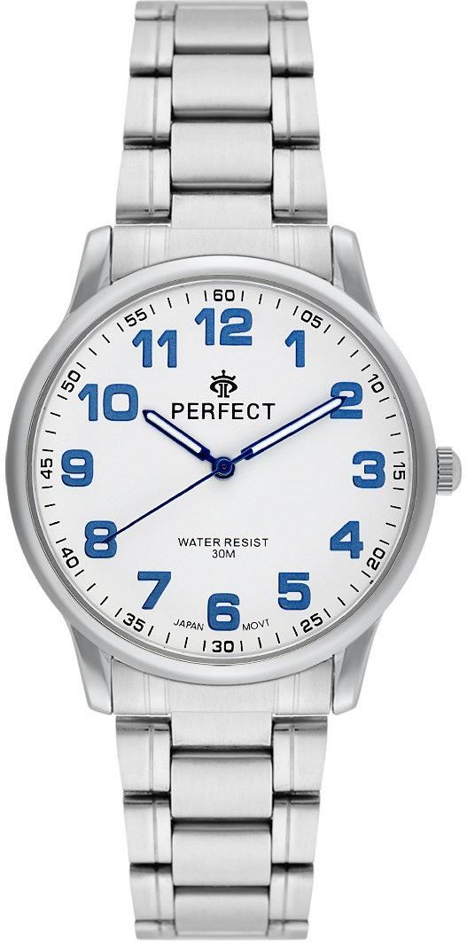 Męski klasyczny okrągły czytelny zegarek Perfect R417N-10 - metalowa koperta i stalowa bransoleta w kolorze srebrnym, biała tarcza czasomierza, kontrastowe cyfry i wskazówki, klasa szczelności 30M. Japoński mechanizm kwarcowy