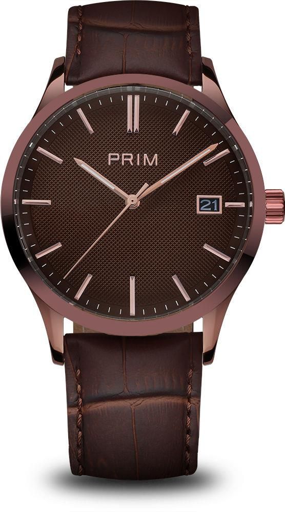 Męski klasyczny stalowy wodoszczelny zegarek PRIM Parita Men W01P.13228.D - stalowa koperta, skórzany pasek, brązowa tarcza czasomierza, klasa szczelności 50M, szafirowe szkło. Japoński mechanizm kwarcowy. Elegancki zegarek dla mężczyzny