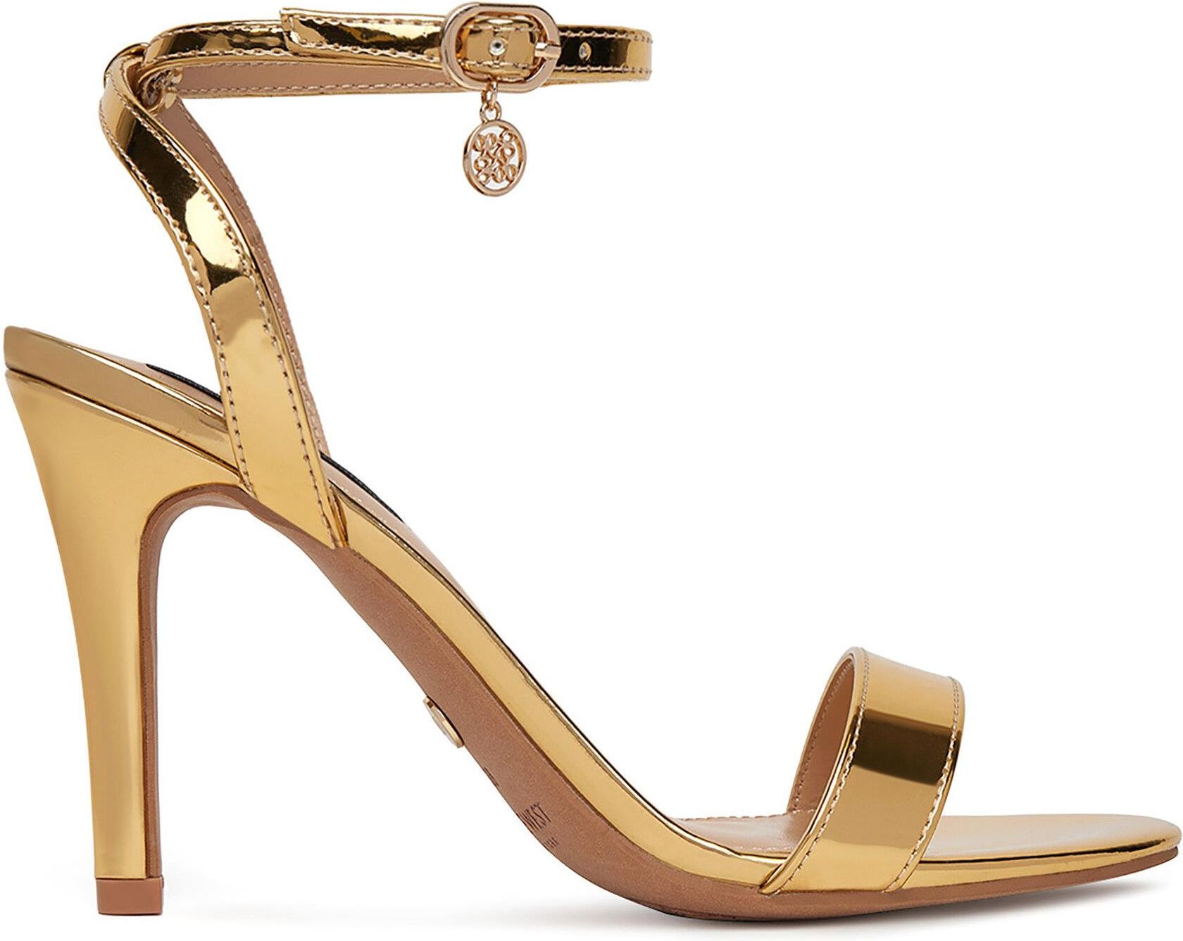 Odkryj elegancję i blask z sandałami Nine West w złotym kolorze! Idealne na specjalne okazje, te wizytowe buty zachwycają swoim wysublimowanym designem. Wykonane z wysokogatunkowego tworzywa syntetycznego, zapewniają trwałość i komfort użytkowania. Delikatna szpilka dodaje sylwetce smukłości, podkreślając jej kobiecy charakter. Zapięcie na sprzączkę gwarantuje doskonałe dopasowanie i stabilność, dzięki czemu możesz czuć się pewnie przez cały dzień. Te złote sandały to nie tylko modowy akcent, ale także niezawodny wybór na każdą elegancką okazję. Dodaj je do swojej kolekcji i poczuj się wyjątkowo! Nine West to amerykańska marka modowa, której początki sięgają lat 70. Swoją nazwę zawdzięcza adresowi budynku przy jednej z ulic Nowego Jorku. Marka szybko zyskała sporą popularność, dzięki czemu posiada butiki niemal na wszystkich kontynentach. Nine West znane jest ze swoich odważnych, ale eleganckich projektów. W naszej ofercie znajdziesz szykowne buty i torebki dla kobiet, które lubią nowojorski styl glamour. Zachwycą Cię szczególnie skórzane botki, czółenka czy sandały na obcasie z gustownymi ozdobami. Odkryj całą ofertę Nine West w CCC!