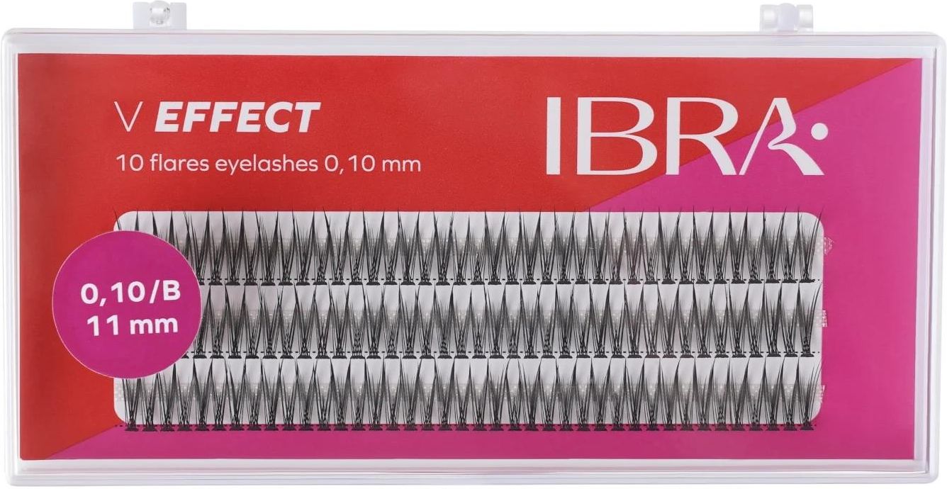 Ibra Kępki rzęs V effect 0,10 B 11mm Ibra Profesjonalne kępki ułożone w charakterystycznym kształcie litery „V” długość rzęsek zmniejsza się stopniowo od zewnętrznych stron do środka kępki, przez co nadają bardzo nowoczesny efekt znany jako "Fish Tail" oraz "Jaskółki". Przeniosą Twój makijaż w zupełnie nowy wymiar. Uzyskaj modny unikatowy look inspirowany makijażami gwiazd. Zalety kępek "V effect" marki IBRA Makeup: idealne do delikatnych stylizacji, dostępne w różnych długościach, idealne do makijażu dla osób, które wolą subtelniejszy efekt.