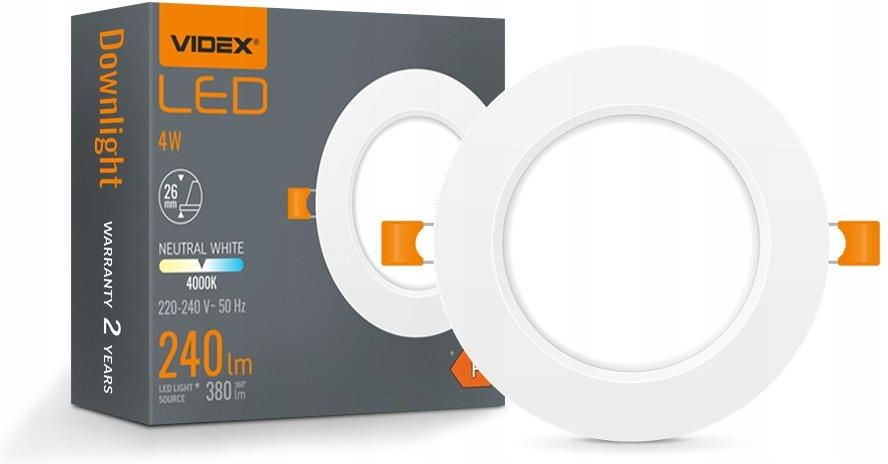 Oprawa Sufitowa LED Wpuszczana Biała Plafon Videx 4W 240lm 9,8cm Okrągła Nowoczesne oświetlenie dla każdego wnętrza – LED oprawa Downlight VIDEX 4W Odkryj nową generację oświetlenia z LED Oprawą Downlight VIDEX 4W – idealnym rozwiązaniem dla osób ceniących nowoczesność, oszczędność energii i estetykę. Ta wpuszczana oprawa sufitowa jest nie tylko lekka i wydajna, ale także niezwykle funkcjonalna, zapewniając przyjemne, neutralne światło o temperaturze barwowej 4000K. Dzięki przemyślanej konstrukcji i nowoczesnym diodom LED umieszczonym z tyłu oprawy, zapewnia doskonałe oświetlenie każdego pomieszczenia, jednocześnie minimalizując zużycie energii. Kluczowe cechy i zalety – Dlaczego warto wybrać LED oprawę VIDEX 4W ✔️ Energooszczędność: Oprawa zużywa tylko 4W mocy, generując strumień świetlny o wartości 240 lumenów. Dzięki temu oświetlenie jest jasne i równomierne, przy minimalnym zużyciu energii. ✔️ Wysoka jakość światła: Temperatura barwowa 4000K (neutralny biały) i wskaźnik oddawania barw Ra > 80 zapewniają naturalne i komfortowe oświetlenie, które nie męczy oczu. ✔️ Łatwy montaż: Dzięki szerokim krawędziom i niewielkiej grubości lampy (tylko 27 mm), instalacja jest szybka i łatwa. Otwór montażowy może różnić się w granicach 1 cm, co zapewnia większą elastyczność podczas instalacji. ✔️ Trwałość i niezawodność: Oprawa jest wykonana z ognioodpornego tworzywa sztucznego, co zapewnia długotrwałe użytkowanie bez ryzyka pęknięć czy żółknięcia. Przewidywana żywotność to aż 30 000 godzin pracy. Zastosowanie – Jak i gdzie możesz wykorzystać LED oprawę Downlight VIDEX 4W Oprawa LED Downlight VIDEX 4W jest niezwykle wszechstronna, co czyni ją idealnym wyborem do różnych zastosowań: ✔️ Wnętrza mieszkalne: Idealna do oświetlenia kuchni, łazienek, salonów czy korytarzy, gdzie wymagana jest równomierna i przyjemna barwa światła. ✔️ Biura i miejsca pracy: Zapewnia komfortowe warunki oświetleniowe, które sprzyjają koncentracji i redukują zmęczenie oczu, nawet przy długotrwałej pracy. ✔️ Pomieszczenia użytkowe: Oprawa świetnie sprawdzi się w sklepach, restauracjach czy innych miejscach publicznych, gdzie liczy się estetyka i funkcjonalność oświetlenia. ✔️ Strefowanie przestrzeni: Dzięki różnym mocom dostępnym w tej samej serii, możesz z łatwością zróżnicować oświetlenie w poszczególnych strefach jednego pomieszczenia. Specyfikacja techniczna – Wszystko, co powinieneś wiedzieć o LED oprawie VIDEX 4W Moc w trybie włączenia: 4 W Strumień świetlny oprawy: 240 Lm Użyteczny strumień świetlny źródła światła: 380 Lm Temperatura barwowa: 4000K (neutralny biały) Klasa energetyczna: F Napięcie znamionowe: AC 220-240 V, 50/60 Hz Kąt rozproszenia światła: 120° Rozmiar otworu montażowego: Ø77-82 mm Wymiary: 98 mm x 98 mm x 26 mm Klasa ochrony IP: IP20 Materiał obudowy: Plastik ognioodporny Godziny pracy: 30 000 h Cykle włącz/wyłącz: 20 000 Zakres temperatur pracy: -20° do +40°C Wymienne źródło światła: Przez producenta Klasa ochronności: II Zawartość rtęci: Nie Promieniowanie ultrafioletowe: Nie Opakowanie zbiorcze: 40 szt. Dzięki LED Oprawie Downlight VIDEX 4W możesz cieszyć się nowoczesnym, energooszczędnym i trwałym oświetleniem, które doskonale sprawdzi się w każdym wnętrzu. Zamów już dziś i odkryj, jak łatwo możesz poprawić jakość oświetlenia w swoim domu lub biurze!