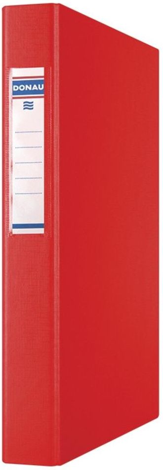 Segregator Donau A4, 40 mm, 4 ringi, czerwony Segregator ringowy Donau o szerokości grzbietu 40mm został wykonany z tektury o grubości 1,9mm pokrytej ekologiczną folią polipropylenową o strukturze płótna. Wnętrze zostało pokryte białą wyklejką papierową. Segregator posiada wymienną, obustronną …
