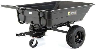 Przyczepka transportowa KRYSIAK. Wymiary całkowite 1600 x 960 x 760 mm. Wymiary skrzyni z czarnego tworzywa 1210 x 950 x 300 mm, ładowność 400 kg, pojemność 200 l. 2 koła pneumatyczne 16 x 6.50-8, koło podpórkowe obrotowe 6". 2W1 do ciągnięcia i do pchania ręcznego, funkcja wywrotki.