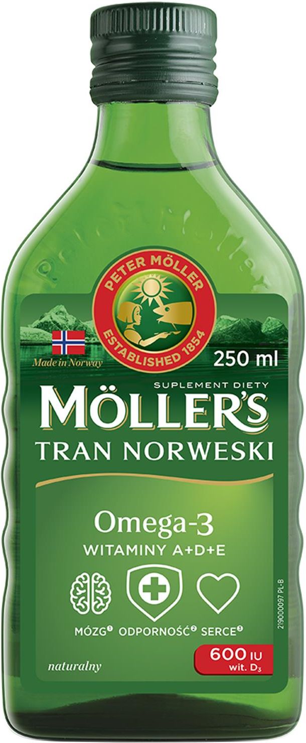 Moller's Tran Norweski Naturalny Omega-3 Witaminy A+D+E Suplement Diety 250ml Wspomaga pracę mózgu i serca. Kwas tłuszczowy omega-3 przyczynia się do prawidłowej pracy mózgu oraz prawidłowego widzenia. Kwas tłuszczowy omega-3 DHA i EPA przyczyniają się do prawidłowej pracy serca. Wspomaga odporność. Witamina D wspomaga odporność oraz utrzymanie zdrowych kości. Witamina A przyczynia się do prawidłowego widzenia i wspiera układ odpornościowy. Stosowanie Dorośli i dzieci powyżej 3 roku życia: 5 ml. Przechowywanie Po otwarciu przechowywać w lodówce nie dłużej niż 3 miesiące. Przechowywać w temperaturze pokojowej. Chronić od światła i wilgoci. Przechowywać w sposób niedostępny dla małych dzieci. Przeciwwskazania i środki ostrożności Przyjmowanie innych preparatów z witaminami A i D przez kobiety w ciąży i dzieci należy skonsultować z lekarzem. Nie należy przekraczać zalecanej dziennej porcji. Dla utrzymania prawidłowego stanu zdrowia należy stosować zróżnicowaną dietę i prowadzić zdrowy tryb życia. Suplement diety nie może być stosowany jak substytut (zamiennik) zróżnicowanej diety. Składniki Olej z wątroby dorsza (ryby), naturalny aromat, octan DL-alfa-tokoferylu (wit. E), przeciwutleniacz (mieszanina tokoferoli) RWS Kwasy tłuszczowe omega-3 1,1 g kwas dokozaheksaenowy (DHA) 0,5g kwas eikozapentaenowy (EPA) 0,4g Witamina A 250 µg (31%*) Witamina D 15 µg = 600 IU (300%*) Witamina E 3 mg (25%*) Olej z wątroby dorsza (ryby), naturalny aromat, octan DL-alfa-tokoferylu (wit. E), przeciwutleniacz (mieszanina tokoferoli) *% referencyjnej wartości spożycia Pojemność: 250ml