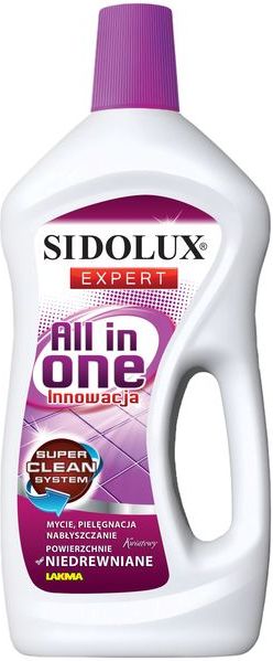 PŁYN DO MYCIA/PIELĘGNACJI I NABŁYSZCZANIA POWIERZCHNI NIEDREWNIANYCH SIDOLUX EXPERT ALL IN ONE 750ml Sidolux All in One do powierzchni niedrewnianych to doskonały środek o szerokim zastosowaniu do domów i mieszkań, w których podłogi wykonane są z różnych, niedrewnianych materiałów płyn doskonale myje, nabłyszcza, renowuje oraz zabezpiecza podłogi znajduje zastosowanie do powierzchni wykonanych m.in. z paneli, lastryko, glazury, płytek PVC i innych.Zastosowanie nowoczesnego systemu Super Clean zapewnia powierzchni najwyższy poziom czystości, bez jakichkolwiek smug polimery zawarte recepturze tworzą powłokę, która nadaje powierzchni satynowy połysk, zabezpiecza ją przed uszkodzeniami mechanicznymi oraz zabezpiecza przed ponownym osadzaniem się brudu tworzy antypoślizgową powłokę i zwiększa bezpieczeństwo użytkowania podłogi doskonale myje i czyści utrudnia osadzanie się brudu nabłyszcza i odświeża wygląd podłogi bez konieczności polerowania zabezpiecza podłogi przed uszkodzeniami mechanicznymi pojemność: 750ml