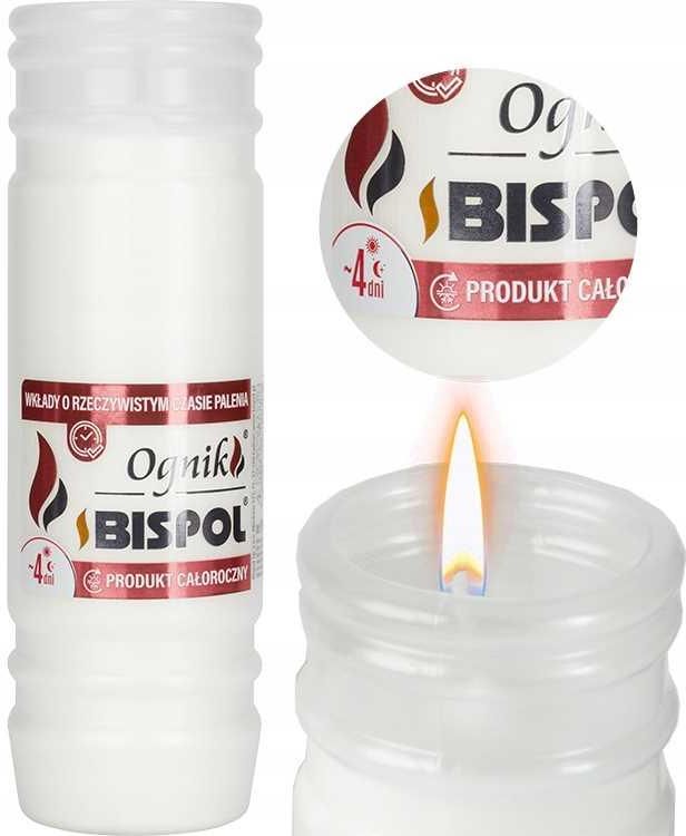 BISPOL - Wkład Zalewany Ognik WP4 - 1 szt. BISPOL - Wkład Zalewany Ognik WP4 - 1 szt. Wkład Zalewany Ognik WP4 Wkład Zalewany Ognik WP4 jest produktem zalewanym, co oznacza, że parafina lub inny materiał palny wlewa się do pojemnika, tworząc jednolitą, stabilną masa, która spala się równomiernie. Dzięki temu, wkłady nie kopcą podczas palenia, co jest szczególnie istotne w miejscach publicznych, gdzie dbałość o czystość i estetykę jest na wysokim poziomie. Produkt charakteryzuje się jasnym i czystym płomieniem, co gwarantuje nie tylko odpowiednią iluminację, ale także wprowadza nastrój godności i spokoju. Wkład spala się równomiernie przez około 4 dni, co eliminuje konieczność częstej wymiany i pozwala na długotrwałe zachowanie pamięci o bliskich bez konieczności codziennej obecności przy grobie. Specyfikacja Kolor: Biały - neutralny i pasujący do różnych rodzajów zniczy i otoczenia. Czas palenia: Około 4 dni - idealne rozwiązanie na długie weekendy lub święta. Waga: 240 g - stabilność i odporność na warunki zewnętrzne. Średnica:Ø5.5 cm - uniwersalny rozmiar, pasujący do standardowych zniczy. Wysokość: 17.5 cm - zapewnia długotrwałe palenie się bez potrzeby częstej wymiany. Zastosowanie produktu Wkład Zalewany Ognik WP4 jest idealny do użytku w różnorodnych zniczach, zarówno tych tradycyjnych, jak i nowoczesnych. Może być używany w trakcie różnych uroczystości pamięciowych, zarówno na cmentarzach, jak i w innych miejscach pamięci. Produkt sprawdzi się także w domowym zaciszu, tworząc atmosferę refleksji i pamięci o zmarłych. Długotrwałe Palenie Wybierając wkład zalewany Ognik WP4 marki BISPOL, decydujesz się na produkt, który łączy w sobie jakość, efektywność i estetykę. Jest to idealne rozwiązanie dla osób poszukujących niezawodnego i długotrwałego źródła światła, które będzie służyć przez wiele dni bez potrzeby interwencji. BISPOL - Wkład Zalewany Ognik WP4 - 1 szt. Wkład Zalewany Ognik WP4 Wkład Zalewany Ognik WP4 jest produktem zalewanym, co oznacza, że parafina lub inny materiał palny wlewa się do pojemnika, tworząc jednolitą, stabilną masa, która spala się równomiernie. Dzięki temu, wkłady nie kopcą podczas palenia, co jest szczególnie istotne w miejscach publicznych, gdzie dbałość o czystość i estetykę jest na wysokim poziomie. Produkt charakteryzuje się jasnym i czystym płomieniem, co gwarantuje nie tylko odpowiednią iluminację, ale także wprowadza nastrój godności i spokoju. Wkład spala się równomiernie przez około 4 dni, co eliminuje konieczność częstej wymiany i pozwala na długotrwałe zachowanie pamięci o bliskich bez konieczności codziennej obecności przy grobie. Specyfikacja Kolor: Biały - neutralny i pasujący do różnych rodzajów zniczy i otoczenia. Czas palenia: Około 4 dni - idealne rozwiązanie na długie weekendy lub święta. Waga: 240 g - stabilność i odporność na warunki zewnętrzne. Średnica:Ø5.5 cm - uniwersalny rozmiar, pasujący do standardowych zniczy. Wysokość: 17.5 cm - zapewnia długotrwałe palenie się bez potrzeby częstej wymiany. Zastosowanie produktu Wkład Zalewany Ognik WP4 jest idealny do użytku w różnorodnych zniczach, zarówno tych tradycyjnych, jak i nowoczesnych. Może być używany w trakcie różnych uroczystości pamięciowych, zarówno na cmentarzach, jak i w innych miejscach pamięci. Produkt sprawdzi się także w domowym zaciszu, tworząc atmosferę refleksji i pamięci o zmarłych. Długotrwałe Palenie Wybierając wkład zalewany Ognik WP4 marki BISPOL, decydujesz się na produkt, który łączy w sobie jakość, efektywność i estetykę. Jest to idealne rozwiązanie dla osób poszukujących niezawodnego i długotrwałego źródła światła, które będzie służyć przez wiele dni bez potrzeby interwencji.