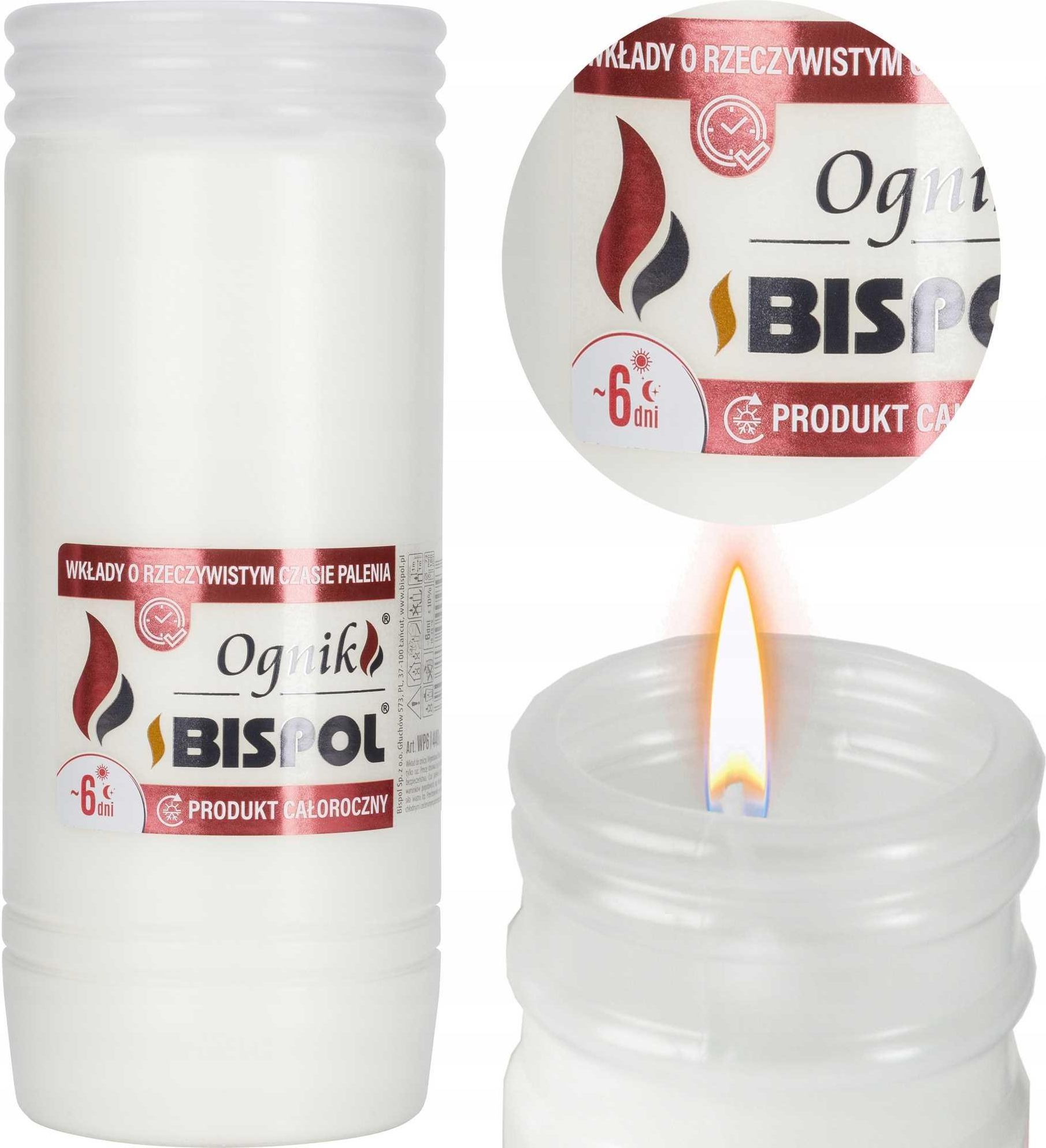 BISPOL - Wkład Zalewany Ognik WP6 - 1 szt. BISPOL - Wkład Zalewany Ognik WP6 - 1 szt. Wkład Zalewany Ognik WP6 Wkład Zalewany Ognik WP6 jest produktem zalewanym, co oznacza, że parafina lub inny materiał palny wlewa się do pojemnika, tworząc jednolitą, stabilną masa, która spala się równomiernie. Dzięki temu, wkłady nie kopcą podczas palenia, co jest szczególnie istotne w miejscach publicznych, gdzie dbałość o czystość i estetykę jest na wysokim poziomie. Produkt charakteryzuje się jasnym i czystym płomieniem, co gwarantuje nie tylko odpowiednią iluminację, ale także wprowadza nastrój godności i spokoju. Wkład spala się równomiernie przez około 6 dni, co eliminuje konieczność częstej wymiany i pozwala na długotrwałe zachowanie pamięci o bliskich bez konieczności codziennej obecności przy grobie. Specyfikacja Kolor: Biały - neutralny i pasujący do różnych rodzajów zniczy i otoczenia. Czas palenia: Około 6 dni - idealne rozwiązanie na długie weekendy lub święta. Waga: 440 g - stabilność i odporność na warunki zewnętrzne. Średnica: Ø7.2 cm - uniwersalny rozmiar, pasujący do standardowych zniczy. Wysokość: 18 cm - zapewnia długotrwałe palenie się bez potrzeby częstej wymiany. Zastosowanie produktu Wkład Zalewany Ognik WP6 jest idealny do użytku w różnorodnych zniczach, zarówno tych tradycyjnych, jak i nowoczesnych. Może być używany w trakcie różnych uroczystości pamięciowych, zarówno na cmentarzach, jak i w innych miejscach pamięci. Produkt sprawdzi się także w domowym zaciszu, tworząc atmosferę refleksji i pamięci o zmarłych. Długotrwałe Palenie Wybierając wkład zalewany Ognik WP6 marki BISPOL, decydujesz się na produkt, który łączy w sobie jakość, efektywność i estetykę. Jest to idealne rozwiązanie dla osób poszukujących niezawodnego i długotrwałego źródła światła, które będzie służyć przez wiele dni bez potrzeby interwencji. BISPOL - Wkład Zalewany Ognik WP6 - 1 szt. Wkład Zalewany Ognik WP6 Wkład Zalewany Ognik WP6 jest produktem zalewanym, co oznacza, że parafina lub inny materiał palny wlewa się do pojemnika, tworząc jednolitą, stabilną masa, która spala się równomiernie. Dzięki temu, wkłady nie kopcą podczas palenia, co jest szczególnie istotne w miejscach publicznych, gdzie dbałość o czystość i estetykę jest na wysokim poziomie. Produkt charakteryzuje się jasnym i czystym płomieniem, co gwarantuje nie tylko odpowiednią iluminację, ale także wprowadza nastrój godności i spokoju. Wkład spala się równomiernie przez około 6 dni, co eliminuje konieczność częstej wymiany i pozwala na długotrwałe zachowanie pamięci o bliskich bez konieczności codziennej obecności przy grobie. Specyfikacja Kolor: Biały - neutralny i pasujący do różnych rodzajów zniczy i otoczenia. Czas palenia: Około 6 dni - idealne rozwiązanie na długie weekendy lub święta. Waga: 440 g - stabilność i odporność na warunki zewnętrzne. Średnica: Ø7.2 cm - uniwersalny rozmiar, pasujący do standardowych zniczy. Wysokość: 18 cm - zapewnia długotrwałe palenie się bez potrzeby częstej wymiany. Zastosowanie produktu Wkład Zalewany Ognik WP6 jest idealny do użytku w różnorodnych zniczach, zarówno tych tradycyjnych, jak i nowoczesnych. Może być używany w trakcie różnych uroczystości pamięciowych, zarówno na cmentarzach, jak i w innych miejscach pamięci. Produkt sprawdzi się także w domowym zaciszu, tworząc atmosferę refleksji i pamięci o zmarłych. Długotrwałe Palenie Wybierając wkład zalewany Ognik WP6 marki BISPOL, decydujesz się na produkt, który łączy w sobie jakość, efektywność i estetykę. Jest to idealne rozwiązanie dla osób poszukujących niezawodnego i długotrwałego źródła światła, które będzie służyć przez wiele dni bez potrzeby interwencji.