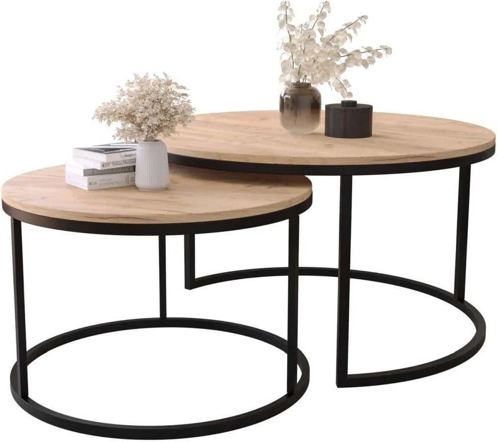 STOLIK KAWOWY 2w1 OKRĄGŁY 80/60CM DĄB CRAFT ZŁOTY Zestaw dwóch okrągłych stolików kawowych MJU to meble, które pięknie komponują się w każdą aranżację wnętrz. Komplet popularnych ław, które są skonstruowane tak, aby jeden stolik mógł schować się pod drugi, można dowolnie ustawiać, przestawiać, wykorzystywać razem lub osobno. Oba stoliki wykonane są przy użyciu najwyższej jakości materiałów. Podstawa zrobiona jest z metalu malowanego proszkowo na matowy czarny kolor. Natomiast blaty wycięto z płyty wiórowej uszlachetnionej odpornym na zabrudzenia papierem dekoracyjnym. Dodatkowo stoliki posiadają małe nóżki, które zapobiegają rysowaniu podłogi. To, co wyróżnia nasz produkt Te modne meble posiadające praktyczny kształt, zachowując przy tym niebanalną formę, stanowią świetny dodatek do każdego salonu, kawiarni czy poczekalni. Stonowaną kolorystykę podkreśla matowa czerń stelaża, a także jego przemyślany i harmonijny kształt dający poczucie, że dwa stoliki stanowią jedną całość. Dzięki temu proponowany zestaw okrągłych stolików kawowych MJU zyskuje wyrazisty design idealnie wpisujący się w styl industrialny i nowoczesny, a także w minimalistyczną aranżację wnętrz. To niebanalne rozwiązanie to wybór klasyki w śmiałej i oryginalnej formie. Stoliki można dowolnie łączyć lub wykorzystywać osobno. Zalety produktu Wysoka jakość Stabilna konstrukcja Prosty montaż Blat grubości 1,6 cm Łatwe w utrzymaniu czystości Wymiary Wysokość stolika dużego: 46 cm Wysokość stolika małego: 40 cm Średnica blatu dużego: 80 cm Średnica blatu małego: 60 cm Grubość blatu: 1,6 cm Materiał Blaty - meblowa wiórowa melaminowana Stelaż - metal malowany proszkowo Obrzeże - wykończone tworzywem ABS (charakteryzującym się dużą wytrzymałością mechaniczną i chemiczną) Warto wiedzieć Płyta meblowa wiórowa, która została wykorzystana do stworzenia zestawu okrągłych stolików kawowych MJU posiada atest higieniczny, który gwarantuje, że produkt jest bezpieczny. Blaty są również odporne na zabrudzenia i łatwe w utrzymaniu czystości. Metalowe nóżki wykonano ze stali nierdzewnej, która została pomalowana proszkowo na kolor czarny. To najlepsza metoda do utrzymania stabilnego koloru i pozbyciu się problemu z odpryskiwaniem lub łuszczeniem się lakieru. Zatem produkt jest nie tylko bezpieczny, ale i wykonany z najwyższą starannością przy użyciu najlepszych dostępnych materiałów. Użytkowanie Produkt należy użytkować zgodnie z przeznaczeniem. Powierzchnię mebla czyścić przy pomocy miękkiej szmatki. Unikać stosowania silnie działających środków chemicznych. Galeria