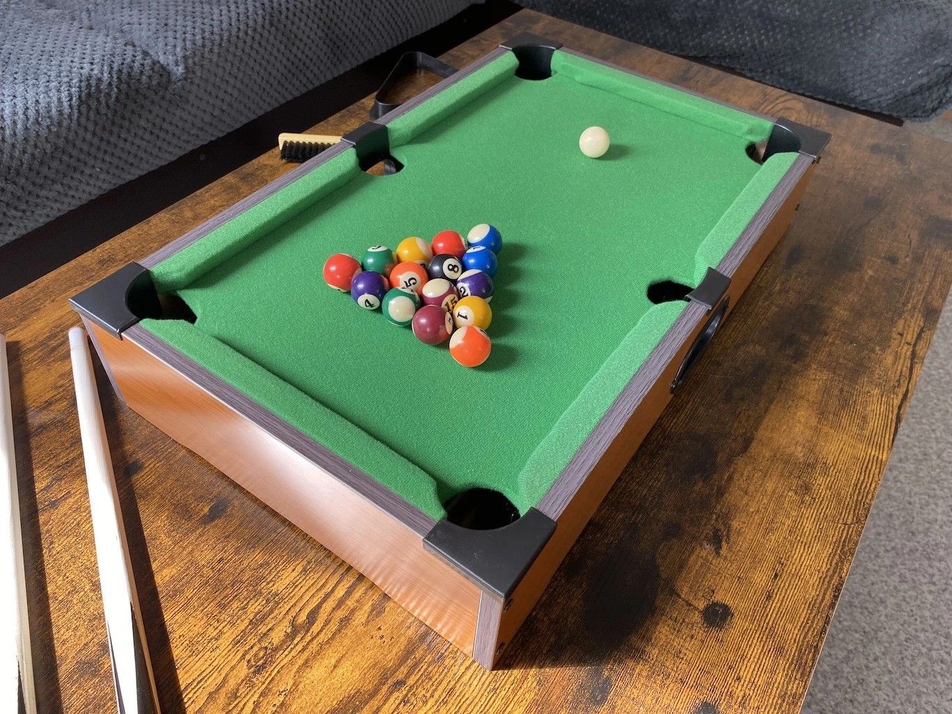 Mini stół bilardowy z drewnianymi kijami i małymi kulami. Świetna zabawa w domu na stole lub dywanie. Kule wpadają z boku, dzięki czemu po zakończeniu gry można je łatwo ułożyć z powrotem na stole. Mini Pool zawiera: 1x plansza do gry Wymiary planszy: 51 x 32 cm. Wysokość ok. 9 cm. Plansza do gry …
