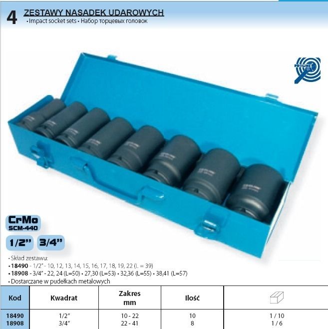 Proline Zestaw nasadek UDAROWYCH 1/2 10-22mm CrMo SCM-440 18490 Zestaw nasadek udarowych Proline 18490 to niezbędne narzędzie w każdym warsztacie, zarówno profesjonalnym, jak i domowym. Oferując wszechstronność w wykonywaniu prac mechanicznych, naprawach oraz konserwacji, ten zestaw łączy w sobie wysoką jakość wykonania z praktycznością. Idealnie nadaje się do różnorodnych zastosowań, co czyni go doskonałym wyborem dla każdego, kto ceni sobie niezawodność w pracy. Zalety Zestaw nasadek Proline 18490 wyróżnia się kilkoma istotnymi zaletami, które są kluczowe dla użytkowników: wysoka jakość wykonania: Wykonane ze stali chromowo-molibdenowej (CrMo), narzędzia charakteryzują się podwyższoną żywotnością oraz odpornością na uszkodzenia. innowacyjna technologia: System PRO-DRIVE pozwala na niwelowanie kumulowania się nadmiernych obciążeń punktowych, co zwiększa moment obrotowy. kompatybilność: Nasadki są zgodne z większością mechanizmów blokujących, co czyni je niezwykle wszechstronnymi. wszechstronność zastosowań: Szeroki zakres rozmiarów (10 mm do 22 mm) umożliwia wykonywanie różnorodnych prac. praktyczne opakowanie: Zestaw dostarczany jest w metalowym pudełku, co ułatwia przechowywanie i transport. Specyfikacja Zestaw nasadek udarowych Proline 18490 zawiera 10 nasadek o długości 39 mm, co zapewnia wygodę użytkowania w trudnodostępnych miejscach. W skład zestawu wchodzą nasadki w następujących rozmiarach: 10 mm, 12 mm, 13 mm, 14 mm, 15 mm, 16 mm, 17 mm, 18 mm, 19 mm, 22 mm. Materiały wykonania Zestaw wykonany jest z wytrzymałej stali chromowo-molibdenowej (CrMo), co sprawia, że narzędzia te charakteryzują się wyjątkową odpornością na uszkodzenia oraz długotrwałą żywotnością. Stal CrMo ma dwukrotnie większą wytrzymałość na rozciąganie oraz trzykrotnie wyższą granicę plastyczności w porównaniu do tradycyjnych nasadek wykonanych ze stali narzędziowej chromowo-wanadowej. Kompatybilność Nasadki są kompatybilne z różnymi systemami, co podkreśla ich wszechstronność. Ich gniazda kwadratowe pasują do większości mechanizmów blokujących, co czyni je idealnym rozwiązaniem zarówno dla profesjonalnych warsztatów, jak i do użytku domowego. Zestaw nasadek udarowych Proline 18490 łączy w sobie wysoką jakość, funkcjonalność oraz trwałość, co czyni go odpowiednim narzędziem do wielu zastosowań mechanicznych, oferując użytkownikom pełną satysfakcję z jego użytkowania.