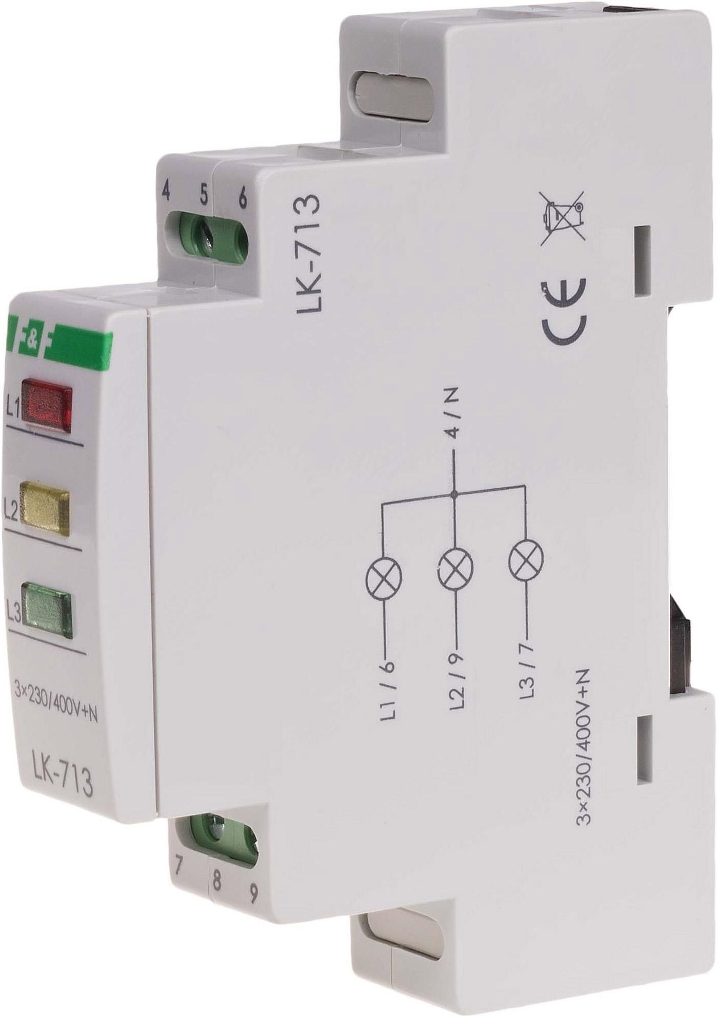 PRZEDSTAWIAMY PAŃSTWU LAMPKĘ SYGNALIZACYJNĄ LK-713R FIRMY F&F PRZEZNACZENIE Lampka sygnalizacyjna LK-713 służy do optycznej sygnalizacji obecności napięcia w poszczególnych fazach sieci trójfazowej. DZIAŁANIE Obecność napięcia w fazie sygnalizowana jest świeceniem odpowiedniej LED włączonej w obwód tej fazy. MONTAŻ Sprawdzić kolejność faz. Odłączyć zasilanie. Zamocować lampkę na szynie. Podłączyć wg schematu. DANE TECHNICZNE Napięcie zasilania: 3×230 V+N Kontrola zasilania: 3 × LED (8×4 mm) Kolory LED: 3 x czerwona Prąd znamionowy: 1,7 mA Przyłącze: zaciski śrubowe 2,5 mm2 Moment dokręcający: 0,4 Nm Pobór mocy: 1,1 W Temperatura pracy: -25 ÷ 50 °C Wymiary: 1 moduł (18 mm) Montaż: na szynie 35 mm Stopień ochrony: IP20 DEKLARACJA ZGODNOŚCI UE