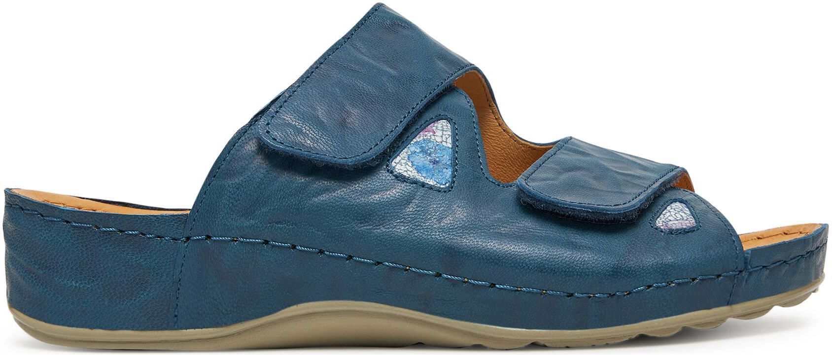 KLAPKI DR.BRINKMANN 700747-51 BLUE DAMSKIE Cholewka: skóra Wyściółka: skórzana Podeszwa: PU Wkładka: skórzana, zdrowotna Tęgość: Tęgość G Zapięcie: zapinane na rzep