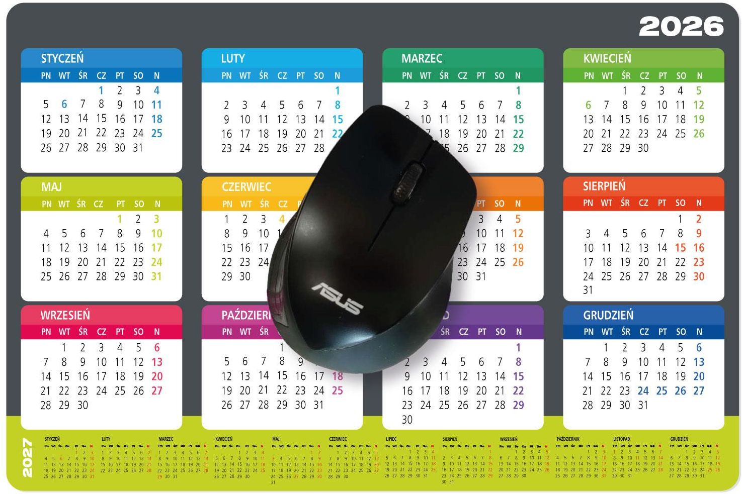 Podkładka pod myszkę z kalendarzem 2026/2027 Opis wykonania Wielkość: 30x20cm Grubość: ok 2,2 mm Tworzywo: elastyczne z piankowym spodem, wzmocnione poliestrem Wzór: kolorowy nadruk kalendarza na rok 2026 i na dole skróconego kalendarza na rok 2027 Właściwości elastycznej podkładki z kalendarzem …