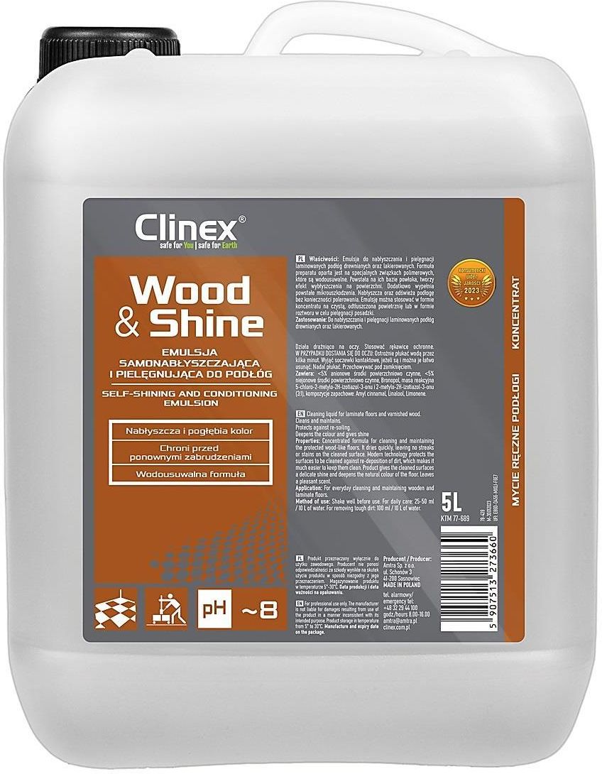 CLINEX - WOOD&SHINE - EMULSJA SAMOPOŁYSKOWA DO PANELI I PODŁÓG - 5L Clinex Wood&Shine to profesjonalna emulsja samonabłyszczająca i pielęgnująca do drewnianych posadzek laminowanych i lakierowanych. Preparat został stworzony z myślą o pielęgnacji i ochronie podłóg panelowych. Dzięki innowacyjnej formule opartej na specjalnych, zmywanych związkach polimerowych skutecznie odświeża i nabłyszcza powierzchnie, nadając im elegancki połysk bez konieczności polerowania. Preparat nie tylko nadaje podłodze estetyczny wygląd, ale też zabezpiecza ją, wypełniając mikrouszkodzenia, które mogą powstać podczas codziennego użytkowania. Emulsja Clinex Wood&Shine tworzy na podłodze trwałą powłokę ochronną, która nadaje powierzchni połysk i chroni ją przed dalszymi uszkodzeniami. To idealne rozwiązanie dla podłóg narażonych na intensywne użytkowanie w miejscach takich jak biura, sale konferencyjne, restauracje a także apartamenty. Preparat Clinex Wood&Shine może być stosowany zarówno jako koncentrat, jak i w formie roztworu w zależności od potrzeb. Jako koncentrat, emulsja sprawdza się doskonale na czystych, odtłuszczonych powierzchniach, zapewniając intensywny połysk. W formie roztworu produkt jest idealny do regularnej pielęgnacji podłogi, delikatnie nabłyszczając i odświeżając jej wygląd przy każdym myciu. Najważniejsze Zalety Clinex Wood&Shine: Skuteczne nabłyszczanie: Tworzy połysk na powierzchniach drewnianych i laminowanych bez potrzeby polerowania. Ochrona podłóg: Wypełnia mikrouszkodzenia, chroniąc podłogę przed dalszymi uszkodzeniami. Wszechstronność: Może być stosowany zarówno jako koncentrat, jak i roztwór do regularnej pielęgnacji. Łatwość użycia: Prosty w aplikacji, bez potrzeby polerowania, co oszczędza czas i wysiłek. Preparat Wood&Shine jest idealnym rozwiązaniem dla: Podłóg drewnianych i laminowanych w biurach, restauracjach, hotelach, apartamentach i innych obiektach użyteczności publicznej. Powierzchni lakierowanych, które wymagają regularnej pielęgnacji i ochrony przed zużyciem. Przestrzeni, w których estetyka podłogi odgrywa kluczową rolę w tworzeniu profesjonalnego wizerunku. Sposób użycia: Przed użyciem wstrząsnąć Usunąć z powierzchni wszelkiego typu zanieczyszczenia. Na czystą, odtłuszczoną, zneutralizowaną i dobrze osuszoną powierzchnię równomiernie nałożyć cienką warstwę preparatu przy pomocy mopa (zalecana mikrofibra). W zależności od pożądanego efektu końcowego zaleca się nałożenie 2-3 warstw preparatu. Każdą kolejną warstwę nakładać dopiero po całkowitym wyschnięciu poprzedniej warstwy. Do codziennej pielęgnacji: Mycie ręczne: 100-200 ml/10 L wody Polerowanie maszyną jednotarczową: 1:1