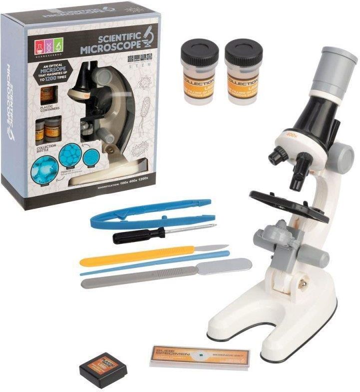 Mikroskop Naukowy Dla Dziecka Szkolny Zestaw 1200x Prezent Edukacyjny 8+ ORYGINALNY POMYSŁ NA PREZENT! - Zapakowany w kolorowy kartonik Kolor - BIAŁY Wzbudza ciekawość oraz zainteresowanie dziecka Doskonały stosunek jakości do ceny Wysoka jakość materiałów i wykonania Zestaw zawiera mikroskop pęseta gotowy preparat 2 szkiełka do preparatów 2 probówki pudełeczko Wymiary mikroskopu: 23 cm x 13 cm x 8 cm Wymiary pudełka: 20 cm x 9 cm x 24 cm Zasilanie dwoma bateriami AA 1.5V (brak w zestawie). Zabawka przeznaczona jest dla dzieci powyżej 8. roku życia. Dlaczego warto wybrać ten zestaw? Mikroskop jest gotowy do użytku po wyjęciu z opakowania. - Wystarczy włożyć baterie - 2x AA (brak w zestawie) Posiada trzy rodzaje powiększenia 100x/400x/1200x. W zestawie znajduje się dużo akcesoriów do zabawy i prac naukowych. Posiada źródło światła LED Regulowana wysokość obiektywu Zestaw zawiera 1x Mikroskop 1x Akcesoria - pęseta, nóż, łopatka, patyczek 1x Gotowy preparat na szkiełku 2x szkiełka do przygotowania preparatów 2x probówki 1x Pudełeczko 1x Śrubokręt 1x Oryginalne opakowanie (Świetnie nada się na prezen!t) Świetny zestaw edukacyjny do zabawy i nauki Edukacyjny mikroskop jest wykonany z plastiku i doskonale nadaje się jako pierwszy zestaw naukowy dla każdego dziecka. Posiada regulowaną wysokość obiektywu oraz 3 tryby powiększenia: 1200x 400x oraz 100x. Wielkości powiększeń można dowolnie zmieniać. Oglądane przedmioty układa się na specjalnej platformie zintegrowanej z mikroskopem. Regulowana Wysokość Mikroskop posiada regulowaną wysokość obiektywu, co pozwala na dopasowanie go do różnych próbek i preparatów. 3 wielkości powiększenia Dzięki obrotowej głowicy mikroskop posiada trzy rodzaje powiększenia 100x/400x/1200x. Skrócona instrukcja obsługi zabawki Po włożeniu baterii należy włączyć mikroskop przyciskiem ON znajdującym się na dole urządzenia. Należy położyć wybrane przez siebie szkiełko z preparatem na stoliku oraz umieścić je pomiędzy łapkami stolika. Preparat powinien znajdować się centralnie nad źródłem światła. Należy ustawić odpowiedni obiektyw, poruszając rewolwerem. Następnie należy poruszać śrubą patrząc przez okular aby ustawić wysokość stolika, aż do momentu uzyskania ostrego obrazu. Gotowe! Specyfikacja techniczna wymiary mikroskopu: wysokość 21,5 x podstawa 12 x 7,5cm zasilanie: 2x AA (brak w zestawie) powiększenia: 100x, 400x, 1200x wymiary opakowania: 19,5 x 24 x 8,5 cm waga z opakowaniem: 560g wiek: 8+ Posiadane certyfikaty CE: oznaczenie umieszczone na wyrobie jest deklaracją producenta, że oznakowany wyrób spełnia wymagania dyrektyw tzw. „Nowego Podejścia” Unii Europejskiej EN71: to norma europejska, która określa wymogi bezpieczeństwa stawiane zabawkom. Aby produkt mógłby być sprzedany na terenie UE musi być zgodny z tą normą. IDEALNY NA PREZENT Mikroskop zapakowany jest w ładny kolorowy kartonik - Dzięki czemu świetnie sprawdzi się na Prezent