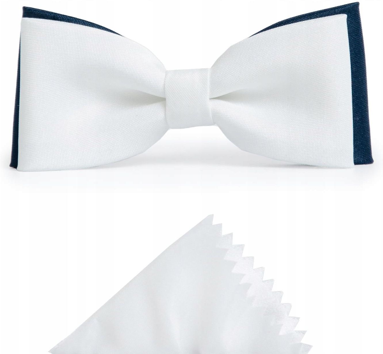 Mucha to ponadczasowy trend mody. Stanowi idealny dodatek do stroju wizytowego. Klasyczne połącznie bieli z granatem nada charakteru każdej stylizacji. Idealnie sprawdzi się jako dodatek do stroju komunijnego, a także podczas innych uroczystości. Sprzedawana w zestawie z białą poszetką, wykończoną ząbkowaniem. Mucha na białym pasku z regulacją do 39 cm. Mucha zapakowana jest w przezroczyste opakowanie. Rozmiar muchy: 10,5x4,5cm Rozmiar trójkątnej poszetki: 22x15cm