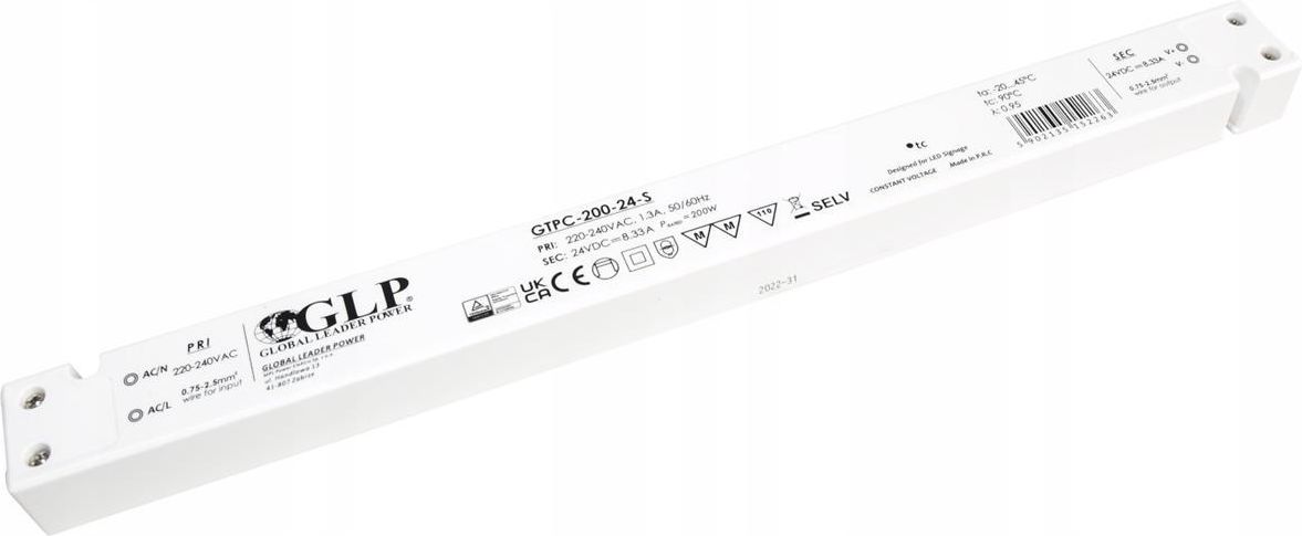 Zasilacz LED napięciowy marki GLP w super wąskiej obudowie 24V 8.33A 200W GTPC-200-24-S przeznaczony jest do pracy w systemach oświetleniowych oraz w systemach elektroniki przemysłowej. Znajduje zastosowanie w szczególności do zasilania taśm LED, modułów LED, paneli LED, liter świetlnych, sterowników LED itp.