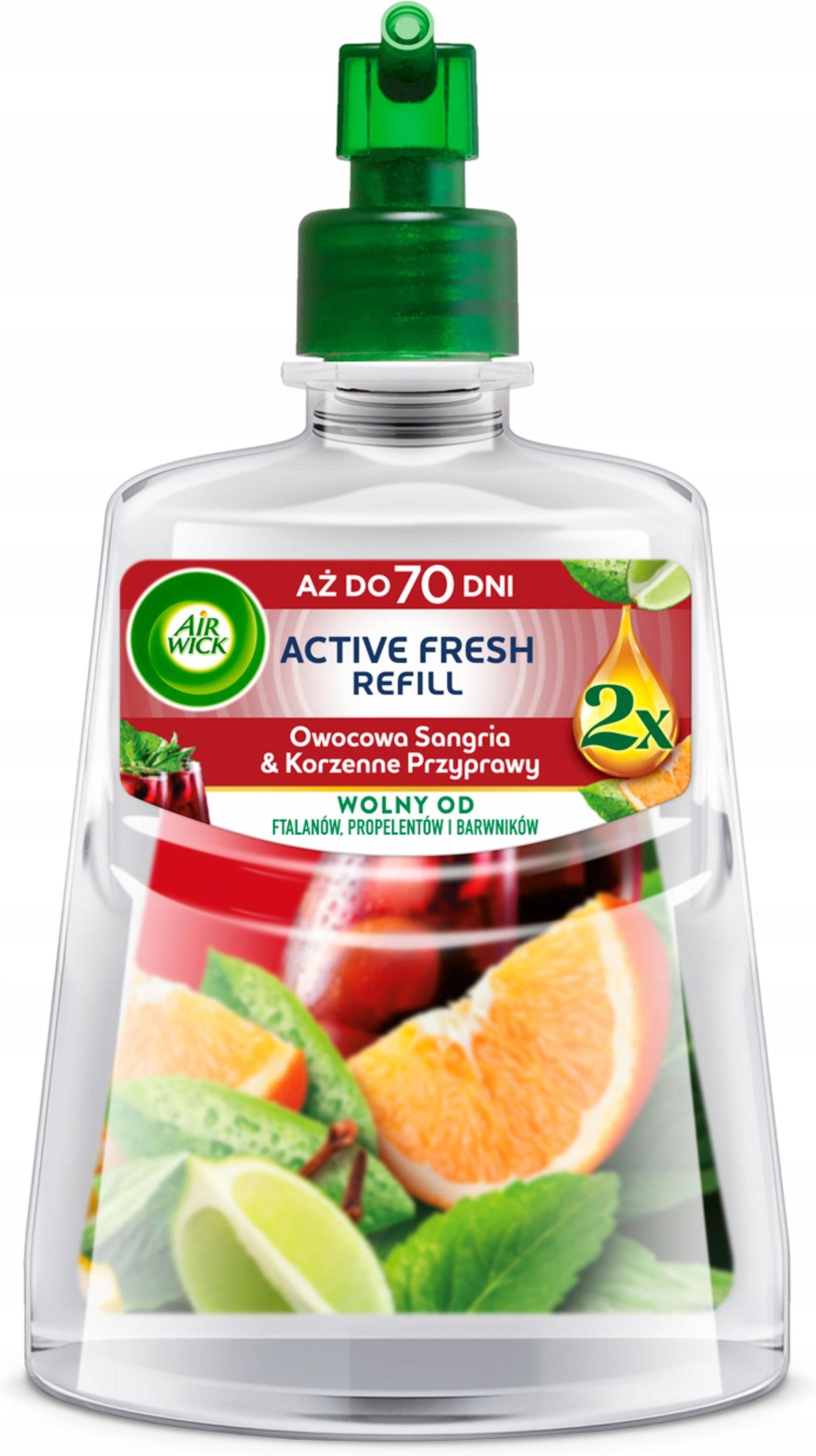 AIR WICK ACTIVE FRESH WKŁAD OWOCOWA SANGRIA 228ML Air Wick Active Fresh Owocowa Sangria -Formuła na bazie wody; -Z naturalnymi olejkami eterycznymi; -95% składników pochodzenia naturalnego; -Bez propelentów, ftalanów i barwników; -Regulacja intensywności zapachu z urządzenia; -Przycisk Instant Boost - zapach na życzenie; -Działanie do 70 dni**; -Opakowanie nadające się do recyklingu; *Zapach wzbogacony 2 razy większą ilością olejków eterycznych w porównaniu do poprzedniej formuły Air Wick.; NUTY ZAPACHOWE: Nuty głowy: Jabłko, Pomarańcz, Czerwone Owoce; Nuty serca: Przyprawy, Cynamon, Goździki; Nuty bazy: Drzewne, Praliny, Wanilia; 95% SKŁADNIKÓW POCHODZENIA NATURALNEGO I OLEJKI ETERYCZNE; Air Wick 24/7 ACTIVE FRESH to wyjątkowa formuła stworzona ze starannie wyselekcjonowanych składników, którą wzbogaciliśmy o naturalne olejki eteryczne. Zawiera aż 95% składników pochodzenia naturalnego i jest pozbawiona ftalanów, propelentów i barwników. Zaproś do swojego domu zapach niesamowitej świeżości i bądź w kontakcie z naturą! AŻ DO 70 DNI ŚWIEŻOŚCI** Air Wick 24/7 ACTIVE FRESH wypełni Twój dom zapachem aż do 70 dni**. WYJĄTKOWA FORMUŁA 24/7 ACTIVE FRESH: Poznaj nasz pierwszy automatyczny odświeżacz powietrza z formułą na bazie wody, który dzięki użyciu unikalnym cząsteczkom, skutecznie neutralizuje brzydkie zapachy przez cały dzień. Air Wick 24/7 ACTIVE FRESH wypełni Twój dom zapachem aż do 70 dni**. NOWOCZESNE URZĄDZENIE Z FUNKCJĄ INSTANT BOOST SPOSÓB UŻYCIA: 1. Umieść baterię w urządzeniu.; 2. Umieść wkład z ulubionym zapachem.; 3. Umieść urządzenie 1,83 metra nad ziemią.; 4. Uruchom urządzenie i rozkoszuj się zapachem.; Dodatkowe istotne informacje dla kupujących Kolory produktu Dołożyliśmy wszelkich starań, aby kolory przedstawiane na ekranie jak najdokładniej odzwierciedlały kolory odcieni, jednak prezentowane barwy mogą różnić się od rzeczywistych wynika to z różnorodności sprzętu komputerowego oraz jego indywidualnych ustawień, a w szczególności ustawień monitora i karty graficznej. Szata graficzna Na opakowaniu mogą występować różnice w szacie graficznej. Produkt może występować w różnej szacie graficznej. Zdjęcie produktu może odbiegać od aktualnego wynikać to może ze zmian dokonanych w wyglądzie przez producenta, gdzie sprzedający nie ma na to wpływu.