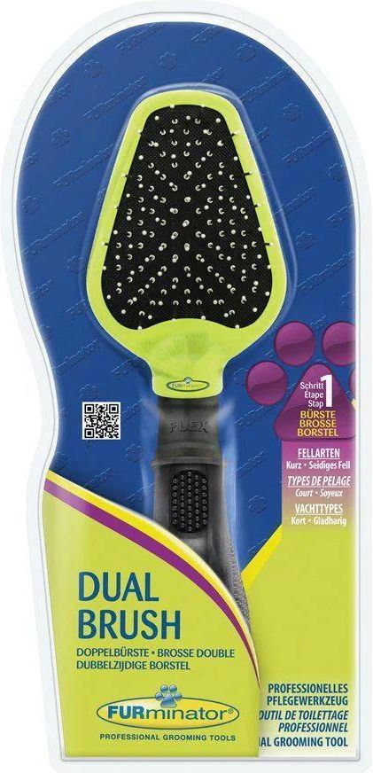 Weź swoją rutynę pielęgnacyjną w swoje ręce, wdrażając FURminator® Ultimate Hair Reduction System™: Szczotkowanie, Wyczesywanie, Kąpiel i Pielęgnacja to pewność pielęgnacji w zaciszu własnego domu. Nasze narzędzia do usuwania sierści, narzędzia do pielęgnacji i rozwiązania do pielęgnacji sierści oferują schemat pielęgnacji dostosowany do każdego psa lub kota. Podwójna szczotka do czesania FURminator® to dwie szczotki w jednej. Metalowe włosie po jednej stronie usuwa luźne włosy wierzchnie, sploty i zanieczyszczenia, jednocześnie masując skórę zwierzęcia. Miękkie nylonowe włosie po drugiej stronie wygładza i nabłyszcza sierść. Ta szczotka to wygodne rozwiązanie do codziennej pielęgnacji sierści zarówno psów, jak i kotów. Codzienne szczotkowanie wygładza, nabłyszcza, zmniejsza splątania i promuje zdrową sierść. Aby uzyskać najlepsze rezultaty, należy używać jej wraz z innymi produktami pielęgnacyjnymi FURminator® w ramach kompletnego schematu.