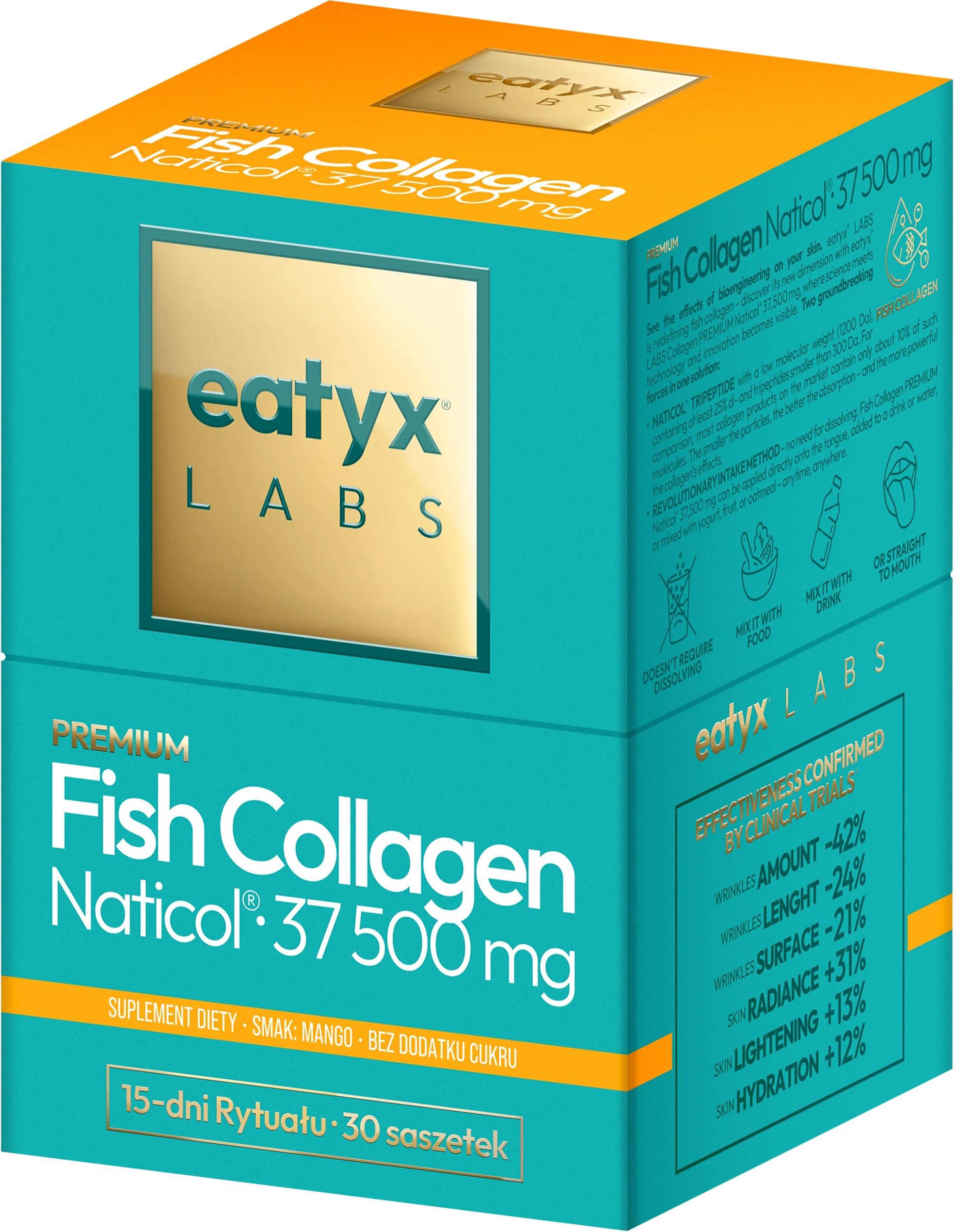 Kup jedną saszetkę – spróbuj, czy smak Ci odpowiada! To nie jest kolejny kolagen „do popijania”. eatyx LABS Premium Fish Collagen Naticol 1 250 mg dopasowuje się do Twojego dnia – nie odwrotnie. Innowacyjna forma proszku sprawia, że nasz kolagen rybi możesz stosować aż na 3 sposoby: dodaj do posiłku (np. owsianki), rozpuść w wodzie, wsyp bezpośrednio do ust i pozwól mu się rozpuścić – bez popijania. Wygodniej się nie da. Jego skuteczność potwierdzona jest badaniami klinicznymi, więc efekty działania widać w lustrze, a nie tylko na etykiecie: -42% liczby zmarszczek, -24% długości zmarszczek, -21% powierzchni zmarszczek; 98% kobiet zauważyło wygładzenie skóry; 93% potwierdziło, że skóra stała się jędrniejsza; 89% osób odczuło większe nawilżenie, a 87% – poprawę stanu skóry i większą elastyczność; 85% osób odczuło mniejszy ból stawów, 77% – mniej bólu mięśni, 74% – mniejszy ból ścięgien, a 59% zauważyło większą elastyczność stawów. Dodatkowo uczestniczki badań wskazywały m.in. redukcję niedoskonałości (91%) oraz mniejsze podrażnienie skóry (95%). Sekretem działania jest doskonała przyswajalność, tkwiąca w „rozmiarze” peptydów. eatyx LABS Premium Fish Collagen Naticol 37 500 mg ma masę cząsteczkową 1200 Da, a dodatkowo zawiera minimum 25% di- i tripeptydów o wielkości cząsteczek mniejszych od 300 Da (dla porównania, w standardowych formułach to do 10%). Krótsze peptydy to nowoczesna forma, która wspiera biodostępność i szybkie „wejście” w codzienną rutynę. Biodostępność Naticol x3Peptide, na bazie którego stworzyliśmy eatyx LABS Premium Fish Collagen Naticol, jest potwierdzona badaniami. W testach klinicznych oceniono ją po doustnym podaniu vs. po podaniu kolagenu rybiego konkurencji o wielkości cząsteczek 2000 Da. Poziom hydroksyproliny, stosowanej jako biomarker kolagenu, mierzono w skórze i stawach. Wyniki wskazały, że Naticol x3Peptide charakteryzuje się lepszą biodostępnością: w skórze o 26%, w stawach o 11%. Owocowy, tropikalny smak mango uprzyjemnia regularne spożycie. Słodzony erytrytolem – nieposiadającym wartości energetycznej i mającym zerowy indeks glikemiczny – odpowiedni dla osób z insulinoopornością i cukrzycą. Jedna saszetka to mniej niż 5 kcal! Czysty skład: bez konserwantów, barwników, sztucznych aromatów czy dodatku cukru – jedynie to, co faktycznie jest potrzebne, w najlepszej możliwej formie. Bez glutenu, bez laktozy. Dla kogo eatyx LABS Premium Fish Collagen Naticol 1 250 mg? Dla każdego, kto chce wprowadzić prosty, przyjemny rytuał i szuka kolagenu, który jest maksymalnie wygodny – w domu, w pracy i w podróży. Dla każdego, kto oczekuje realnych rezultatów widocznych na skórze i w sprawności, a nie tylko liczy, że kolagen „może się sprawdzi”. Suplement diety.