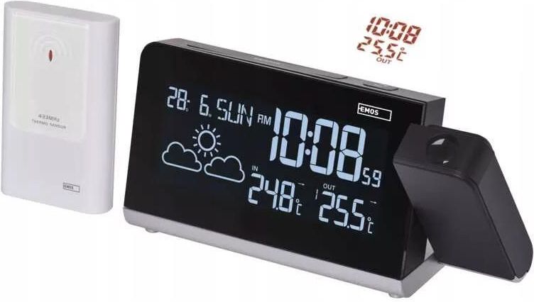 Stacja pogodowa z projektorem E8466 EMOS Nowoczesna stacja meteorologiczna E8466 firmy EMOS to doskonałe rozwiązanie, dzięki któremu deszcz Cię nie zaskoczy i będziesz wiedzieć na jaką pogodę się przygotować. Prezentowany model posiada wyświetlacz najnowszej technologii, co zapewnia widoczność prawie pod każdym kątem. Zależnie od aktualnej temperatury wyświetlacz zmienia kolor. Stacja pogodowa została również wyposażona w inne dodatkowe funkcje np. prognozę pogody, projekcję czasu i temperatury, budzik . Produkt służy także do mierzenia temperatury wewnętrznej oraz zewnętrznej i posiada funkcję zapisywania minimalnej i maksymalnej temperatury. Stacja zasilana jest jedną baterią CR2032 , która znajduje się w zestawie). Do czujnika należy dokupić dwie baterie 1,5 V AA . Parametry: możliwość zawieszenia na ścianie: nie projekcja: projekcja czasu i temperatury prognoza pogody: tak ciągłe podświetlenie: tak dodatkowe czujniki: 3 (E08400) min. i maks. temperatura: tak sonda przewodowa do czujnika: nie zegar: DCF (sterowany sygnałem radiowym) kalendarz: tak 12/24 godzinny format czasu: tak zasilanie czujnika: 2× 1,5 V AA (brak w zestawie) zasilanie stacji: 1× CR2032 (w zestawie) zasięg czujnika: do 30 m strefy czasowe: nie data: tak wymiary wyświetlacza: 102 × 42 mm budzik: tak, 2x powtarzane budzenie: tak temperatura wewnętrzna: -5 °C do +50 °C, rozdzielczość 0,1 °C wilgotność wewnętrzna: nie temperatura zewnętrzna: -20 °C do +60 °C, rozdzielczość 0,1 °C wilgotność zewnętrzna: nie ostrzeżenie temperaturowe: nie trend temperatury: tak trend ciśnienia: nie barometr: nie fazy księżyca: nie częstotliwość: 433 MHz podświetlenie LED wyświetlacza: nie podświetlany kolorowy wyświetlacz (black mask): tak wymiary głównej jednostki: 56 × 163 × 80 mm ustawianie wysokości nad poziomem morza: nie zasilacz sieciowy: tak, 4,5 V DC/300 mA (w zestawie) wymiary czujnika: 35 × 65 × 100 mm jednostki temperatury: °C/°F gwarancja: 24 miesiące