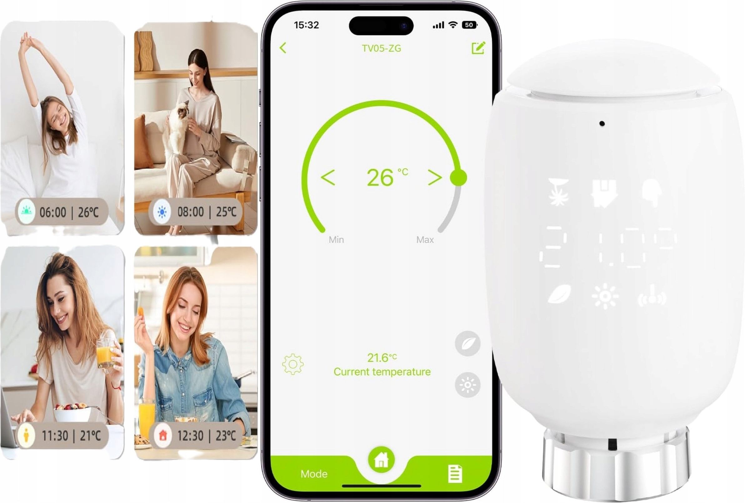 Głowica Termostatyczna Grzejnika Termostat Sterownik Smart Tuya Programowalny Inteligentna Kontrola Ogrzewania W Twoim Domu Inteligentny termostat grzejnikowy Zigbee 3.0 pozwala wygodnie sterować temperaturą w domu z poziomu smartfona lub głosem. Ustawiaj harmonogramy, obniżaj temperaturę, gdy nikogo nie ma w domu i korzystaj z zaawansowanych funkcji, aby zwiększyć komfort oraz ograniczyć zużycie energii. Zdalne sterowanie przez aplikację Tuya / Smart Life Integracja głosowa z Amazon Alexa i Google Home Precyzyjna regulacja temperatury 5-30°C co 0,5°C Tryby inteligentne: harmonogram, wykrywanie otwartego okna, ochrona przed zamarznięciem Łatwy montaż dzięki dołączonym adapterom na popularne zawory Nowoczesny Design I Czytelny Wyświetlacz LCD Termostat wyróżnia się nowoczesnym, kompaktowym wzornictwem typu „eierschale", które estetycznie komponuje się z różnymi wnętrzami. Czytelny wyświetlacz LCD ułatwia odczyt aktualnej temperatury i ustawień, a intuicyjne przyciski umożliwiają szybką obsługę bezpośrednio na urządzeniu. Kompaktowa obudowa - pasuje do większości grzejników Elegancki wygląd, który nie psuje wystroju pomieszczenia Wyraźny ekran dla wygodnego podglądu parametrów Sterowanie Przez Aplikację Tuya / Smart Life I Głos Dzięki łączności Zigbee 3.0 termostat współpracuje z bramką Zigbee (wymagana, brak w zestawie) i integruje się z aplikacją Tuya / Smart Life. Pozwala to na pełną kontrolę ogrzewania z dowolnego miejsca - w domu, pracy czy w podróży. Zdalne włączanie/wyłączanie ogrzewania i zmiana temperatury Tworzenie scen i automatyzacji w aplikacji Tuya / Smart Life Obsługa głosowa przez Amazon Alexa oraz Google Home Dostęp do historii pracy urządzenia do 6 miesięcy Precyzyjna I Oszczędna Regulacja Temperatury Regulowany zakres temperatury 5-30°C z krokiem co 0,5°C pozwala precyzyjnie dopasować warunki do Twoich potrzeb. Możliwość kalibracji temperatury w zakresie ±5°C pomaga uzyskać jak najbardziej rzeczywisty odczyt w konkretnym pomieszczeniu. Zakres regulacji: 5-30°C (krok 0,5°C) Kalibracja temperatury: ±5°C Inteligentne harmonogramy dzienne i tygodniowe Możliwa oszczędność energii nawet do ok. 15% przy właściwej konfiguracji Bezpieczeństwo, Wygoda I Inteligentne Funkcje Urządzenie oferuje szereg praktycznych funkcji zwiększających bezpieczeństwo i komfort użytkowania. Wykrywa nagły spadek temperatury spowodowany otwarciem okna, chroni instalację przed zamarznięciem oraz umożliwia włączenie blokady przed dziećmi. Wykrywanie otwartego okna - automatyczne obniżenie temperatury Funkcja ochrony przed zamarznięciem Blokada rodzicielska (child lock) Praca w ekosystemie inteligentnego domu (Tuya, integracje Zigbee) Łatwy Montaż I Szeroka Kompatybilność Z Zaworami Termostat pasuje do większości standardowych zaworów grzejnikowych, zarówno montowanych pionowo, jak i poziomo. W zestawie znajdują się adaptery do popularnych zaworów Danfoss RA / RAV / RAVL, a metalowa nakrętka zapewnia stabilne mocowanie. Uniwersalne dopasowanie do typowych zaworów grzejnikowych Adaptery w zestawie: Danfoss RA / RAV / RAVL Mocne, metalowe mocowanie ogranicza ryzyko nieszczelności Zasilanie: 2× bateria AA 1,5 V (alkaliczne, brak w zestawie; baterie akumulatorowe nie są wspierane) Najważniejsze Dane Techniczne Typ produktu: inteligentny termostat grzejnikowy (TRV) Model: TRV05-ZG (TV05-ZB) Łączność: Zigbee 3.0 (wymagana bramka Zigbee - brak w zestawie) Protokół: Zigbee Obsługa aplikacji: Tuya / Smart Life (Android, iOS) Integracje: Amazon Alexa, Google Home Tryb sterowania: aplikacja, sterowanie głosowe, ręczne przyciski Wyświetlacz: LCD Zasilanie: 2× bateria AA 1,5 V (alkaliczne) Funkcje: harmonogramy, wykrywanie otwartego okna, ochrona przed zamarznięciem, blokada rodzicielska, historia pracy do 6 miesięcy Montaż: na zaworach grzejnikowych, z adapterami RA/RAV/RAVL w zestawie Zastosowanie: grzejniki w instalacjach domowych, kotły, pompy ciepła (przez sterowanie zaworem grzejnikowym) W zestawie: 1× inteligentny termostat grzejnikowy Zigbee TRV, 1× komplet adapterów Danfoss RA/RAV/RAVL, 1× instrukcja obsługi (baterie oraz bramka Zigbee sprzedawane osobno).