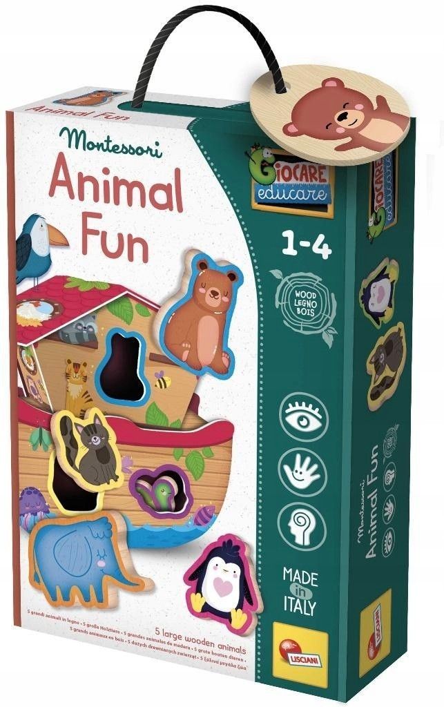 MONTESSORI BABY WOOD ANIMAL FUN Producent: LISCIANI Grupa wiekowa: 12m+ Opakowanie: EAN: 8008324096893 Gra edukacyjna oparta na metodzie Montessori, rozwijająca zmysł dotyku i logiczne skojarzenia. Podczas zabawy dzieci rozpoznają zwierzęta jedynie na podstawie dotyku, a następnie starają się je dopasować do odpowiedniego miejsca w domku. [Kod oferty,762752,8008324096893,2026-03-05 05:11:28]