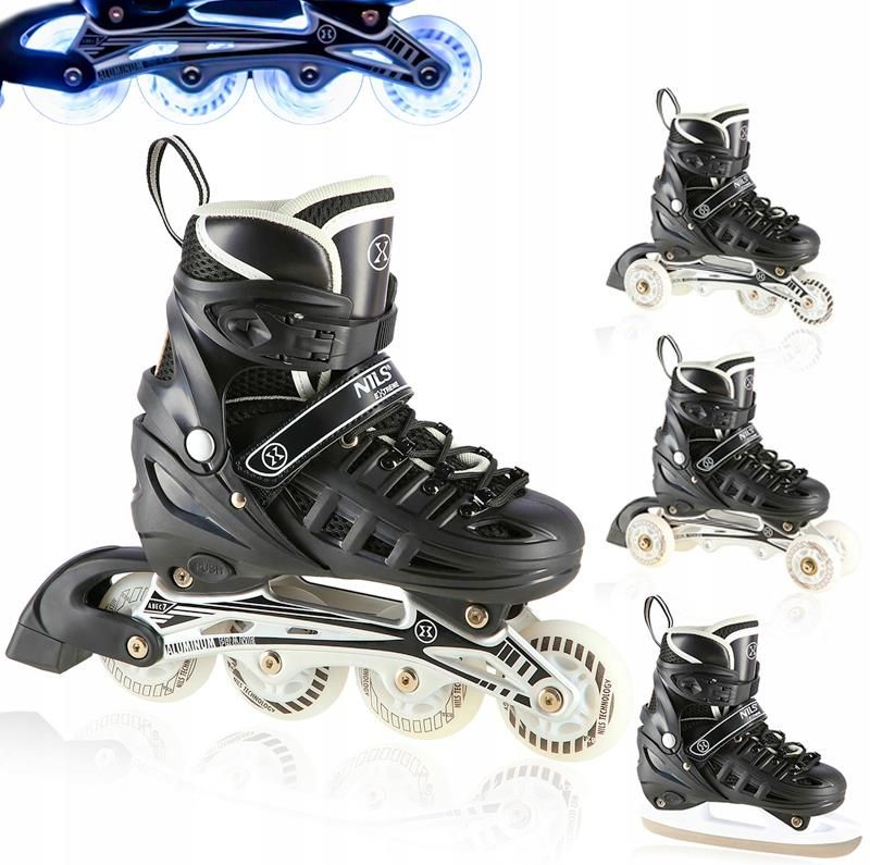 Łyżwy Hokejowe Rolki Regulowane Dla Dziecka LED 4w1 Z Wymienną Płozą NILS Najważniejsze cechy produktu 4 konfiguracje w 1: łyżwy, łyżworolki, wrotki i rolko-wrotki – idealne na każdą porę roku Regulacja rozmiaru: możliwość dopasowania do stopy dziecka – oszczędność pieniędzy i czasu Wysoka jakość materiałów: stal nierdzewna i trwałe tworzywa zapewniają odporność na uszkodzenia Komfort i bezpieczeństwo: zapięcie na rzep, klamrę i sznurowadła gwarantuje stabilność i dobre trzymanie stopy Łożyska ABEC7: płynna i szybka jazda, zarówno na asfalcie, jak i lodzie Dane techniczne Numer katalogowy: NH10905 .Rodzaj: 4w1: wrotki, traktorek, rolki, łyżwy Regulacja rozmiaru: Tak Maksymalna waga użytkownika: 80 kg Kolor: Czarny Zestaw zawiera: Nowe, oryginalne Łyżworolki 4w1 firmy NILS, nasz firmowy kalendarzyk But Rodzaj buta: twardy Wkładka: oddychająca membrana, materiał EVA, 8 mm pianki o dużej gęstości Rodzaj zapięcia: pasek na rzep, sznurowanie, klamra dwusekcyjna Płoza rolki / wrotki Materiał płozy rolki / wrotki: Aluminiowa Kółka Materiał kółek: Kauczukowe - PU Rozmiar kółek: 64 mm, 70 mm, 76 mm Twardość kółek: 82 A Kolor kółek: Biały Łożyska: ABEC-7 Płoza Typ płozy: Hokejowa Materiał płozy: stal wysokiej jakości Tabela rozmiarów S (31-34): 190-215 mm M (35-38): 215-240 mm L (39-42): 240-270 mm Zestaw NH10905 marki Nils Extreme to innowacyjne rozwiązanie 4w1, które zapewni dziecku całoroczną radość z aktywności – zarówno latem, jak i zimą. Jeden model pozwala na łatwe przekształcenie w łyżwy, łyżworolki, wrotki lub rolko-wrotki. Dzięki solidnej konstrukcji i wygodnemu systemowi regulacji rozmiaru, jest to sprzęt, który rośnie razem z dzieckiem i dostosowuje się do jego potrzeb oraz poziomu zaawansowania. FAQ Jak przebiega zmiana trybu? Wymiana elementów odbywa się szybko i intuicyjnie – wszystkie niezbędne komponenty są dołączone do zestawu. Na jaki wiek są przeznaczone? Dzięki regulacji długości buta model NH10905 sprawdzi się u dzieci w wieku od ok. 5 do 12 lat (w zależności od wybranego rozmiaru). Czy to dobry wybór dla początkujących? Tak – model oferuje stabilność i kontrolę, które ułatwiają naukę, a jednocześnie daje możliwości do dalszego rozwoju umiejętności.