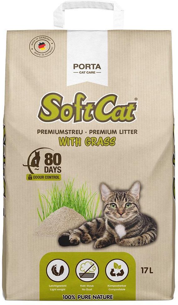 Wiele rodzajów żwirków dla kotów opiera się na minerałach ilastych, które muszą być dodatkowo rozkładane w tym celu. Przyjazny dla środowiska żwirek Porta SoftCat with Grass jest natomiast oparty na włóknach roślinnych! Jest on całkowicie naturalny i biodegradowalny - dzięki czemu można go nawet wyrzucać do toalety, odpadów organicznych, a nawet kompostu ogrodowego. Żwirek jest całkowicie bezpieczny dla kota, nie pyli się i ma bardzo wysoką zdolność zatrzymywania zapachów, dzięki czemu pozostaje świeży w kuwecie i wokół niej przez długi czas! Żwirek Porta SoftCat Grass pochłania również dużo płynów i bardzo mocno się zbryla - pomaga to w szybkim czyszczeniu kuwety. Żwirek jest również delikatny dla wrażliwych łapek kota, dzięki czemu wizyty w toalecie są dla niego przyjemne i wygodne. Niewielka waga żwirku ułatwia jego przenoszenie i transport. Porta SoftCat Grass w skrócie: Doskonały naturalny żwirek do kocich toalet. Odpowiedni również dla kociąt. Innowacyjny: wykonany w 100% z włókien roślinnych, ekonomiczny w użyciu. Naturalny i biodegradowalny: może być łatwo utylizowany w toalecie lub jako odpady organiczne lub kompost. Ekologiczny: bezpieczny dla kota i przyjazny dla środowiska. Skutecznie wiąże zapachy: zapewnia świeżość w kuwecie i wokół niej. Wysoce chłonny: pochłania dużo płynów, do 400% własnej wagi. Bardzo mocne zbrylanie: ułatwia czyszczenie. Mało pyłu: idealny dla wrażliwych dróg oddechowych. Delikatny dla łap: zapewnia przyjemną wizytę w toalecie. Lekki: łatwy do przenoszenia i transportu. Przyjazny dla środowiska: wyprodukowany w Niemczech. Bez dodatków chemicznych. Instrukcje dotyczące utylizacji: Usuwanie grudek żwirku w toalecie domowej powinno odbywać się wyłącznie po konsultacji z lokalnym przedsiębiorstwem użyteczności publicznej. Przepisy mogą się różnić w zależności od miejsca. Nigdy nie należy wyrzucać całego wypełnienia kuwety do toalety domowej. Należy spłukiwać tylko pojedyncze grudki. Utylizacja w toalecie domowej powinna odbywać się tylko w rozsądnych ilościach! Spłukiwanie w toalecie domowej jest przeznaczone tylko dla pojedynczych odpadów! Pojedyncze bryły należy wrzucać do toalety i pozostawić na chwilę do namoczenia. Następnie energicznie spłukać - woda musi być w stanie dostatecznie spłukać i ponownie zwilżyć cząsteczki grudek. Dopiero wtedy wrzuć do toalety kolejną grudkę. W żadnym wypadku nie należy wrzucać do toalety kilku brył odpadów jednocześnie. Do utylizacji i opróżniania zużytej toalety należy użyć - w zależności od lokalnych przepisów dotyczących utylizacji - pojemnika na odpady organiczne, kompostu lub odpadów zmieszanych!
