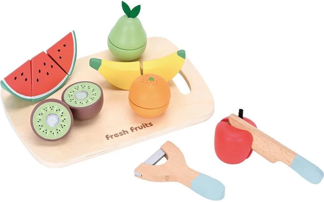 Let your child explore and play with colourful cut-out fruits! This fun playset features juicy watermelon, sweet kiwi, delicious banana, crunchy pear, sparkling orange and fresh apple, all presented on a cutting board. With the included play kitchen knife and peeler, kids can pretend to make fruit salads or prepare healthy snacks for their friends. Perfect for encouraging creative play, learning about healthy foods and strengthening fine motor skills!