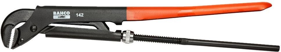 Profesjonalny klucz do rur typu SZWED 90 firmy Bahco o symbolu [142] posiada opatentowany kształt zębów na szczękach (zęby mają dodatni kąt natarcia), oraz układ zębów (zęby mniejsze są w centralnej części szczęk, na zewnątrz i wewnątrz szczęk zęby większe), który pozwala na pewny i mocny chwyt niezależnie od położenia przedmiotu w szczękach, rękojeść pokryta tworzywem antypoślizgowym, zapewnia łatwy i wygodny chwyt w każdych warunkach, nakrętka regulacyjna ze specjalna blokadą co zabezpiecza przed zablokowaniem jej w skrajnym położeniu. Parametry klucza do rur BAHCO 142 maksymalne rozwarcie szczęk (B): 65 mm, zakres chwytania: 1.1/2", długość całkowita (A): 426 mm, wymiar (C): 14,87 mm, szerokość (D): 20,8 mm, waga: 1150 g.