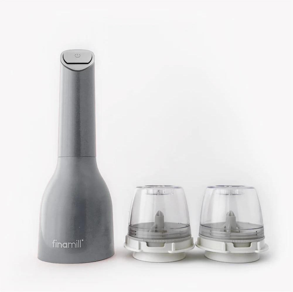 MŁYNEK ELEKTRYCZNY DO SOLI PIEPRZU I ZIÓŁ+2 POJEMNIKI FINAMILL POPIELATY W skład zestawu FinaMill wchodzi 〰〰〰〰〰〰〰〰〰 Młynek FinaMill w kolorze popielatym Dwa pojemniki na przyprawy FinaPod Pro Plus, który nadaje się do standardowych i oleistych przypraw takich jak pieprz, sól, kiminek, kardamon, …