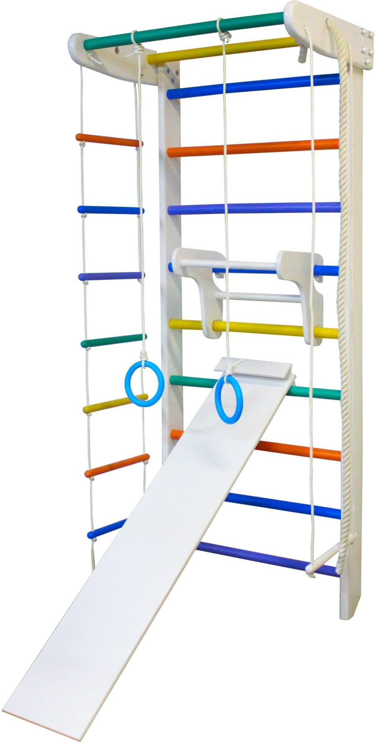 Drabinka gimnastyczna biało-kolorowa Kolibry Plus Irelio Zestaw zawiera: drewniana drabinka gimnastyczna, drążek do podciągania, dodatkowy drążek do podciągania drabinka linowa, kółka gimnastyczne, zjeżdżalnia dwustronna Producent: Małpiszon Kod producenta: 02.011.10.001 EAN: 5908271398404 …
