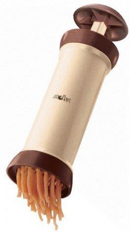 MOHA - Praska dekorator CASTA Szwajcarska firma Moha specjalizuje się w inowacyjnych akcesoriach kuchennych. Za każdym produktem stoi wysoka jakość i bardzo często pomysł aby przygotować coś w kuchni łatwiej , sprytniej lub po prostu lepiej. Praska dekorator w jednym. Idealna do stworzenia wyjątkowych dekoracji w postaci nitek np. z puree ze słodkich kasztanów, masy orzechowej itp. W zestawie znajduje się 8 różnych końcówek do kremu zapakowanych w woreczek do przechowywania zamykany na suwak. Z pomocą praski możesz też przygotować cieniutkie kluseczki.Praska dekorator składa się z tłoka o wysokości 19cm, część środkowa to walec o średnicy 4 cm i długości 15cm oraz pierścienia do mocowania metalowego sitka lub tylek.Całkowita wysokość 20cm, średnica 6,5cmMateriał ABS, SAN, LDPE w kolorze beżowym i ciemnobrązowym , sitko do vermicelli stal nierdzewna.Wymiary wysokość 23cm, długość 9cm, szerokość 6,5cmPrzybliżona waga 0,189 kgOpakowanie tekturowy karton zawieszka