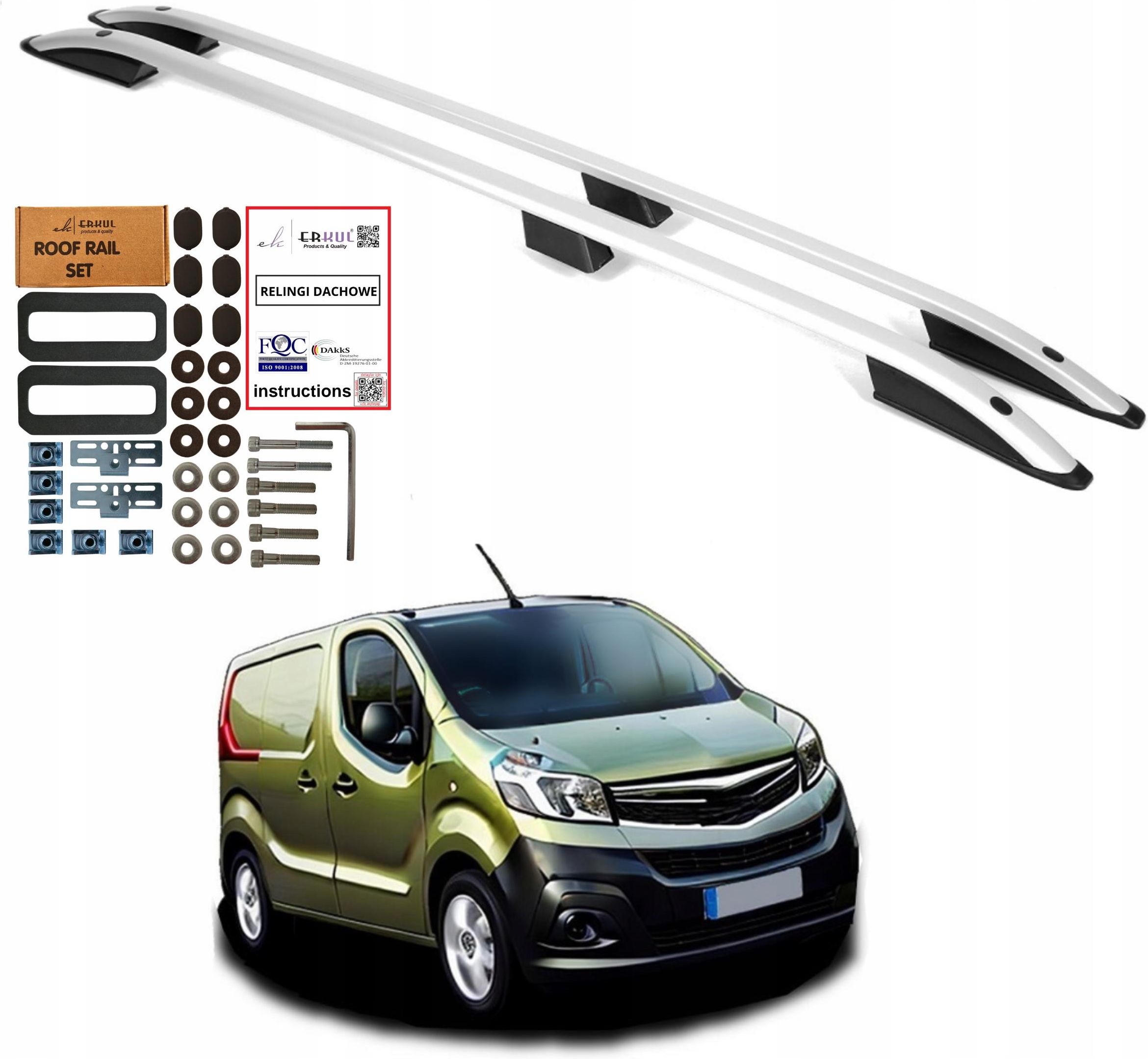 Relingi dachowe OPEL VIVARO RENAULT TRAFIC FIAT TALENTO 2014- LONG SREBRNE Dedykowane relingi dachowe marki ERKUL OTO Do aut Fiat Talento, wersja długa, rok produkcji od 2016 do 2020 Nissan NV300/Primastar II, wersja długa, rok produkcji od 2016 Opel Vivaro, wersja długa, rok produkcji od 2014 do 2019 Renault Trafic, wersja długa, rok produkcji od 2014 Oferujemy Państwu lekkie i praktyczne aluminiowe relingi dachowe wraz z zestawem śrub montażowych. Nośność relingów: 75kg. Opis oraz parametry relingów Konstrukcja aluminiowa ze stopami z wytrzymałego tworzywa sztucznego Wysoka jakość materiałow Kolor: srebrny Gruba ścianka profilu aluminiowego Nowoczesne wzornictwo (wzór stosowany w najdroższych modelach). Materiał odporny na warunki atmosferyczne. Prosty montaż (bez zdejmowania podsufitki, relingi mocowane wytrzymałymi śrubami w fabryczne miejsca na dachu samochodu).